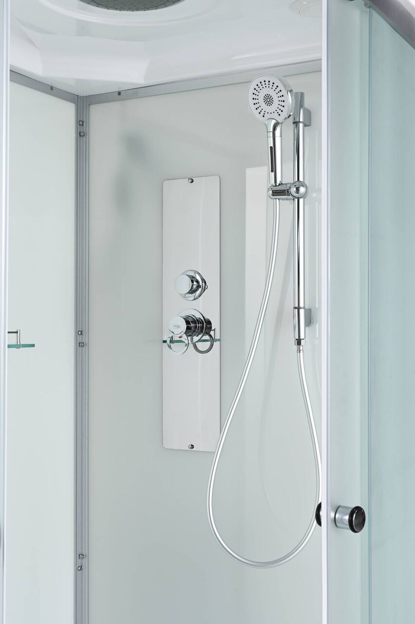 Оснащение Арома-лейка с витамином С / Душевая штанга / Переключатель режимов / Полочка / Сифон / Смеситель / Тропический (верхний) душ