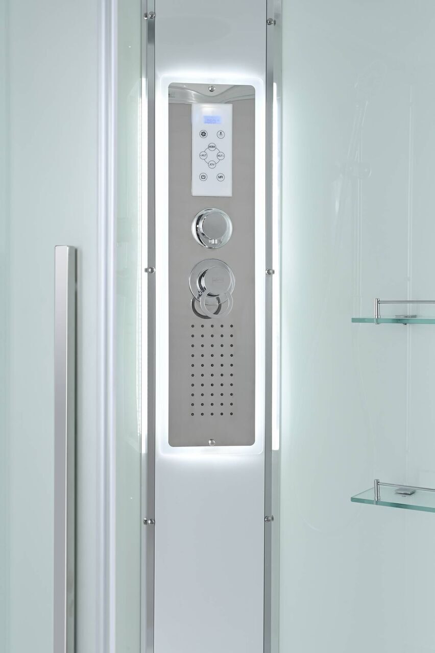 Оснащение bluetooth / LED-подсветка / Арома-лейка с витамином С / Вентиляция / Гидромассажные форсунки / Переключатель режимов / Полимерная вставка в поддон / Полочки / Радио / Сифон / Смеситель / Тропический (верхний) душ