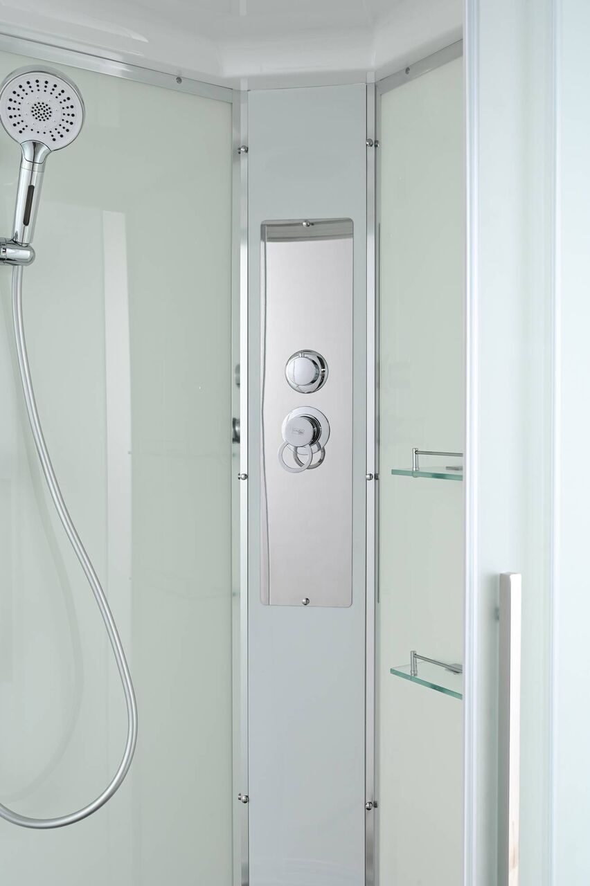 Оснащение Арома-лейка с витамином С / Душевая штанга / Переключатель режимов / Полимерная вставка в поддон / Полочки / Сифон / Смеситель / Тропический (верхний) душ