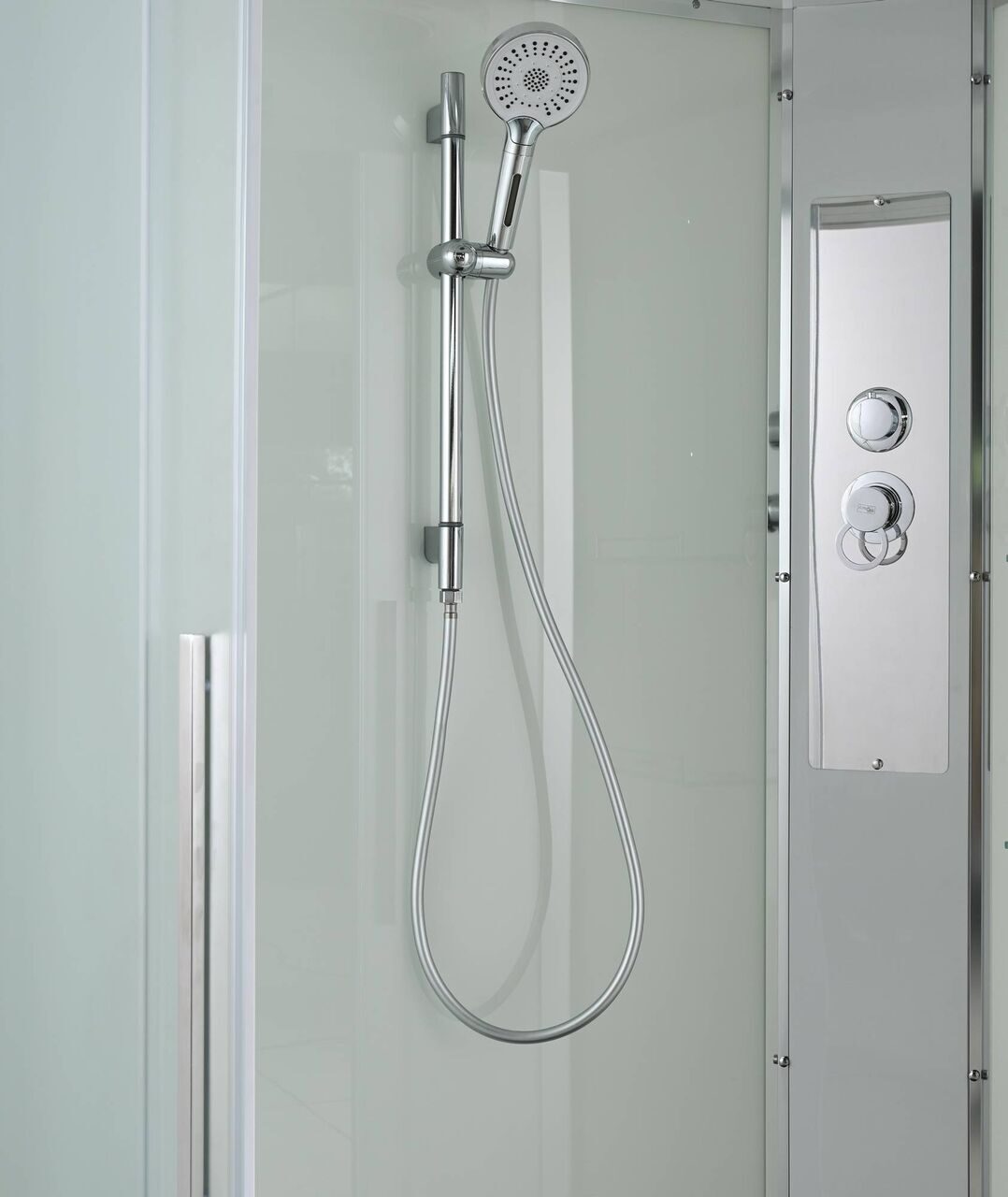 Оснащение Арома-лейка с витамином С / Душевая штанга / Переключатель режимов / Полимерная вставка в поддон / Полочки / Сифон / Смеситель