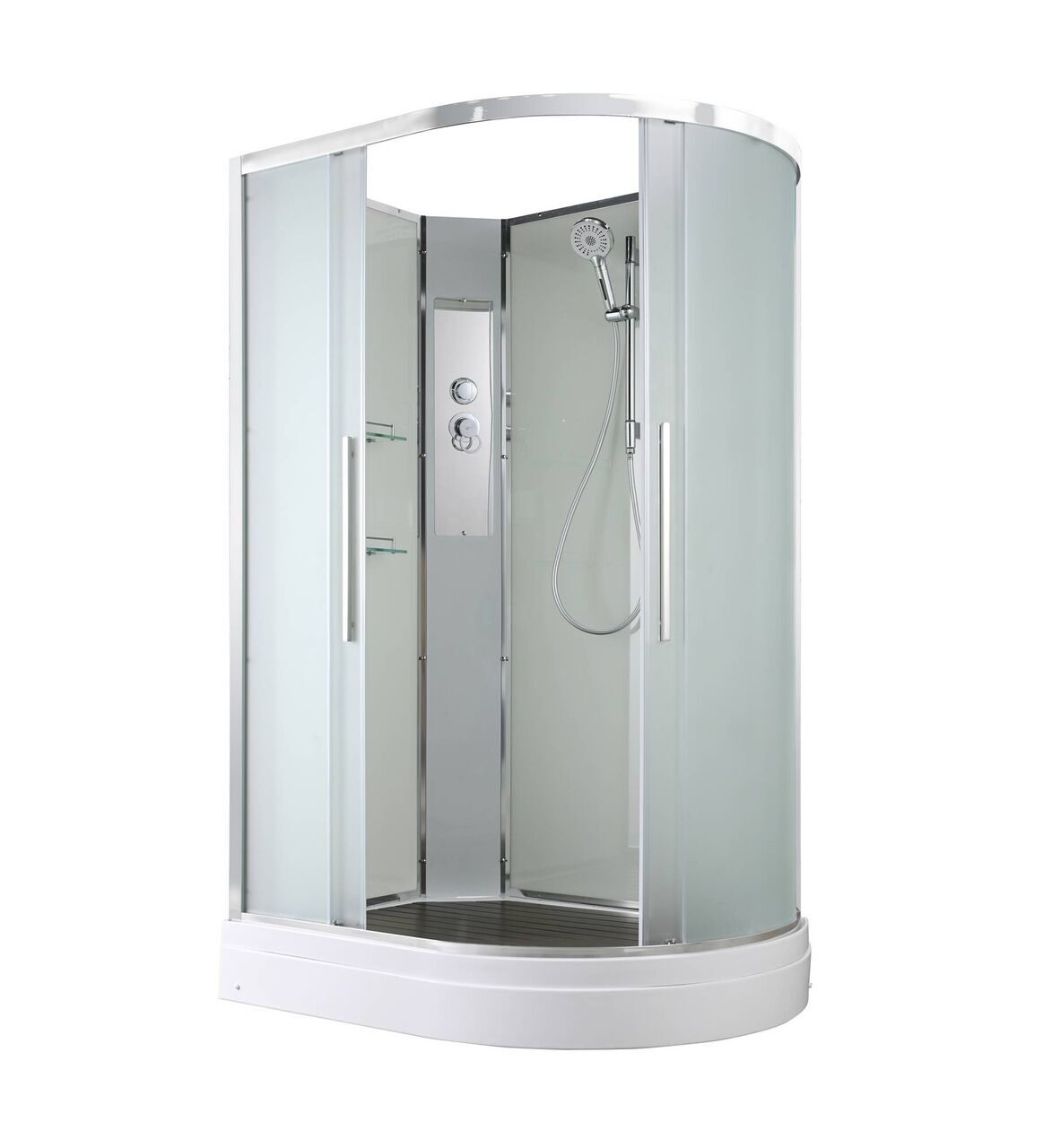Оснащение Арома-лейка с витамином С / Душевая штанга / Переключатель режимов / Полимерная вставка в поддон / Полочки / Сифон / Смеситель