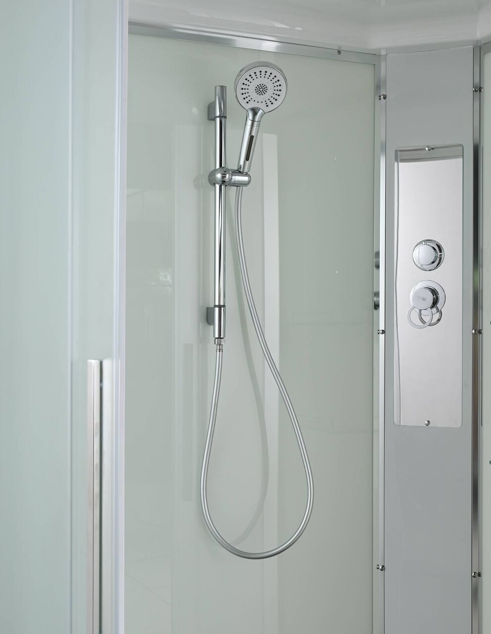 Оснащение Арома-лейка с витамином С / Душевая штанга / Переключатель режимов / Полимерная вставка в поддон / Полочки / Сифон / Смеситель / Тропический (верхний) душ