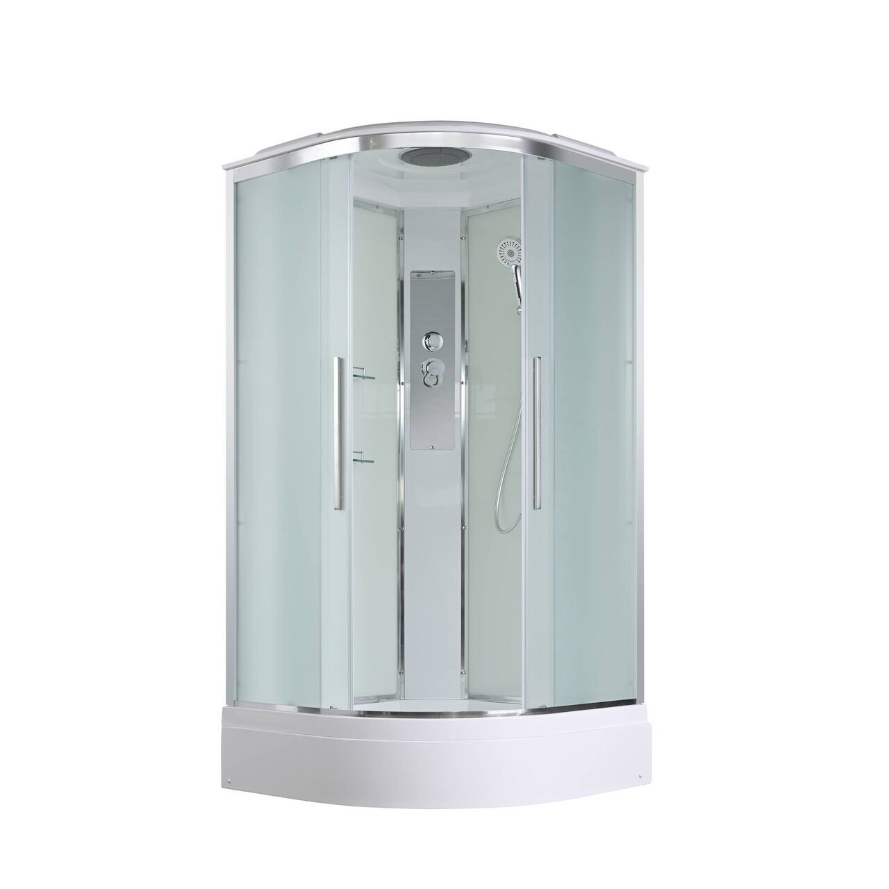 Оснащение Арома-лейка с витамином С / Душевая штанга / Переключатель режимов / Полимерная вставка в поддон / Полочки / Сифон / Смеситель / Тропический (верхний) душ
