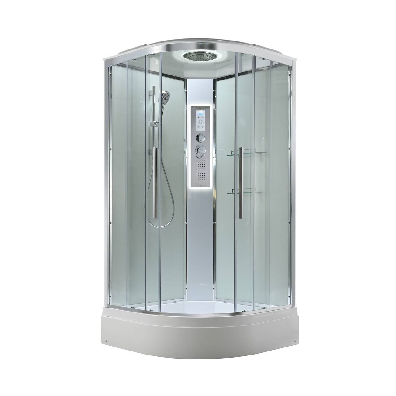 Оснащение bluetooth / LED-подсветка / Арома-лейка с витамином С / Вентиляция / Гидромассажные форсунки / Переключатель режимов / Полимерная вставка в поддон / Полочки / Радио / Сифон / Смеситель / Тропический (верхний) душ