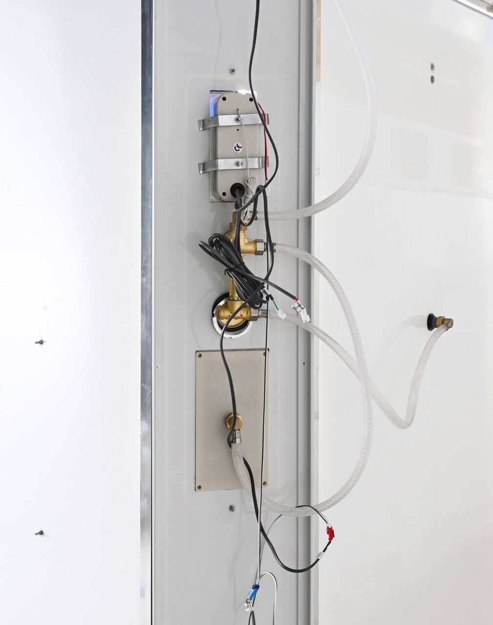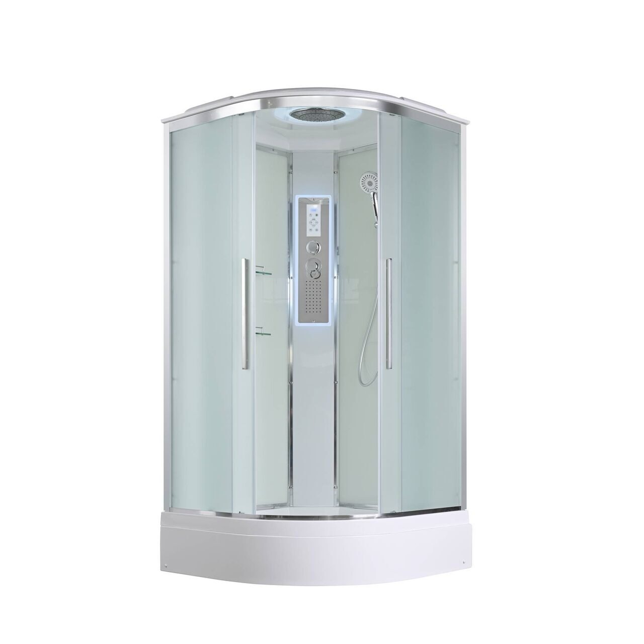 Оснащение bluetooth / LED-подсветка / Арома-лейка с витамином С / Вентиляция / Гидромассажные форсунки / Переключатель режимов / Полимерная вставка в поддон / Полочки / Радио / Сифон / Смеситель / Тропический (верхний) душ