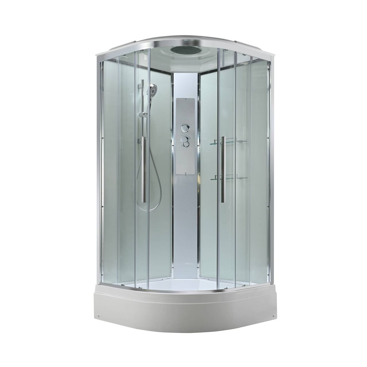 Оснащение Арома-лейка с витамином С / Душевая штанга / Переключатель режимов / Полимерная вставка в поддон / Полочки / Сифон / Смеситель / Тропический (верхний) душ