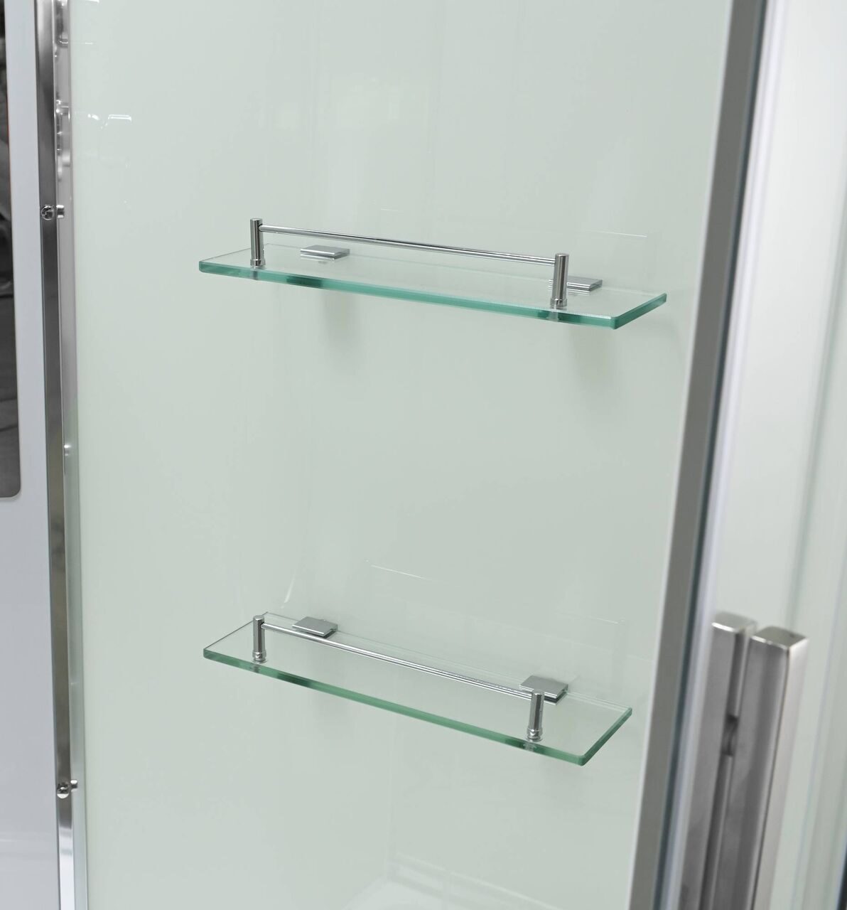 Оснащение Арома-лейка с витамином С / Душевая штанга / Переключатель режимов / Полимерная вставка в поддон / Полочки / Сифон / Смеситель / Тропический (верхний) душ