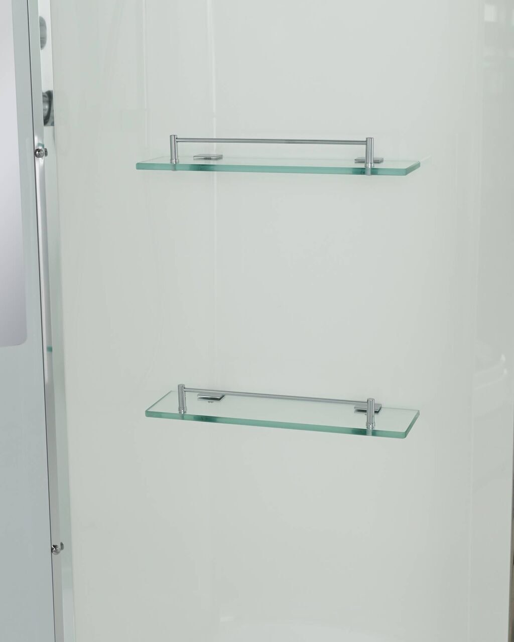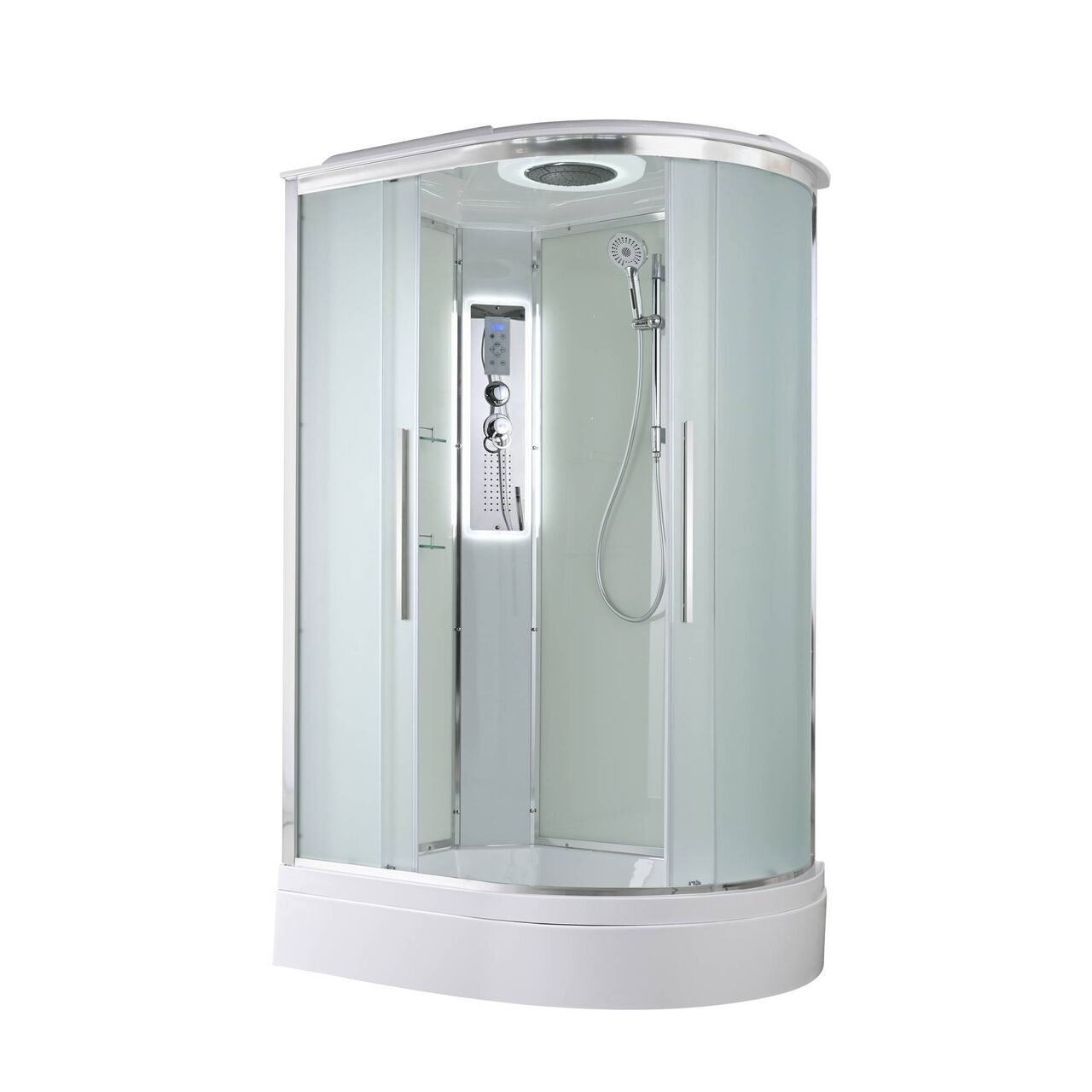 Оснащение bluetooth / LED-подсветка / Арома-лейка с витамином С / Вентиляция / Гидромассажные форсунки / Переключатель режимов / Полимерная вставка в поддон / Полочки / Радио / Сифон / Смеситель / Тропический (верхний) душ