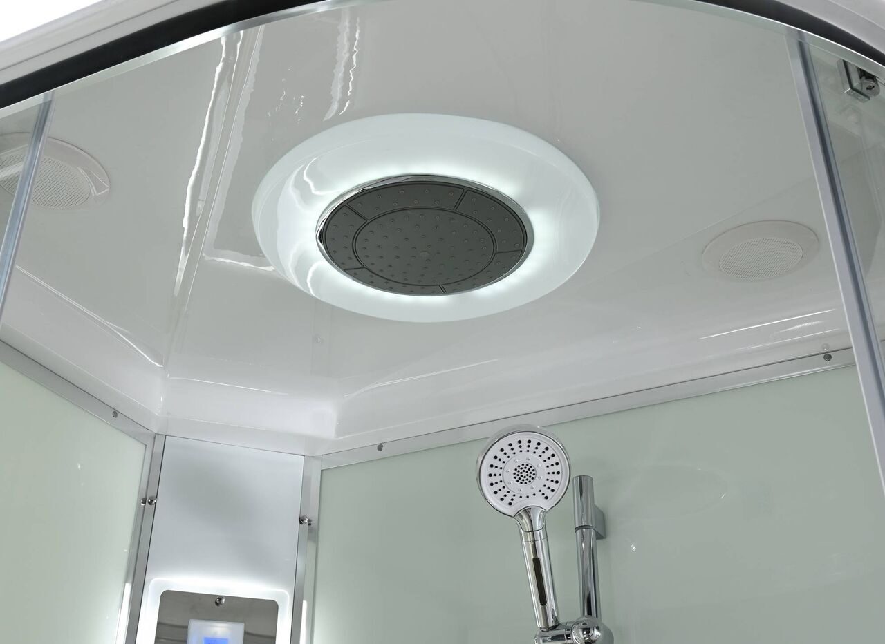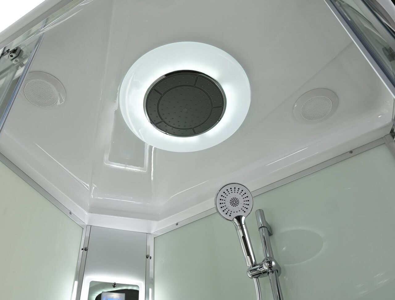 Оснащение bluetooth / LED-подсветка / Арома-лейка с витамином С / Вентиляция / Гидромассажные форсунки / Переключатель режимов / Полимерная вставка в поддон / Полочки / Радио / Сифон / Смеситель / Тропический (верхний) душ