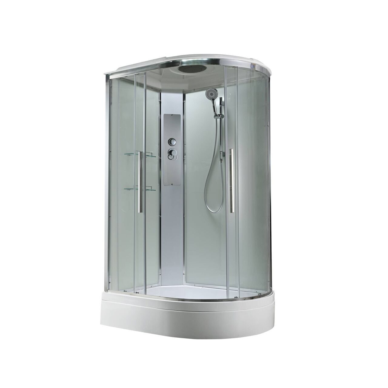 Оснащение Арома-лейка с витамином С / Душевая штанга / Переключатель режимов / Полимерная вставка в поддон / Полочки / Сифон / Смеситель / Тропический (верхний) душ