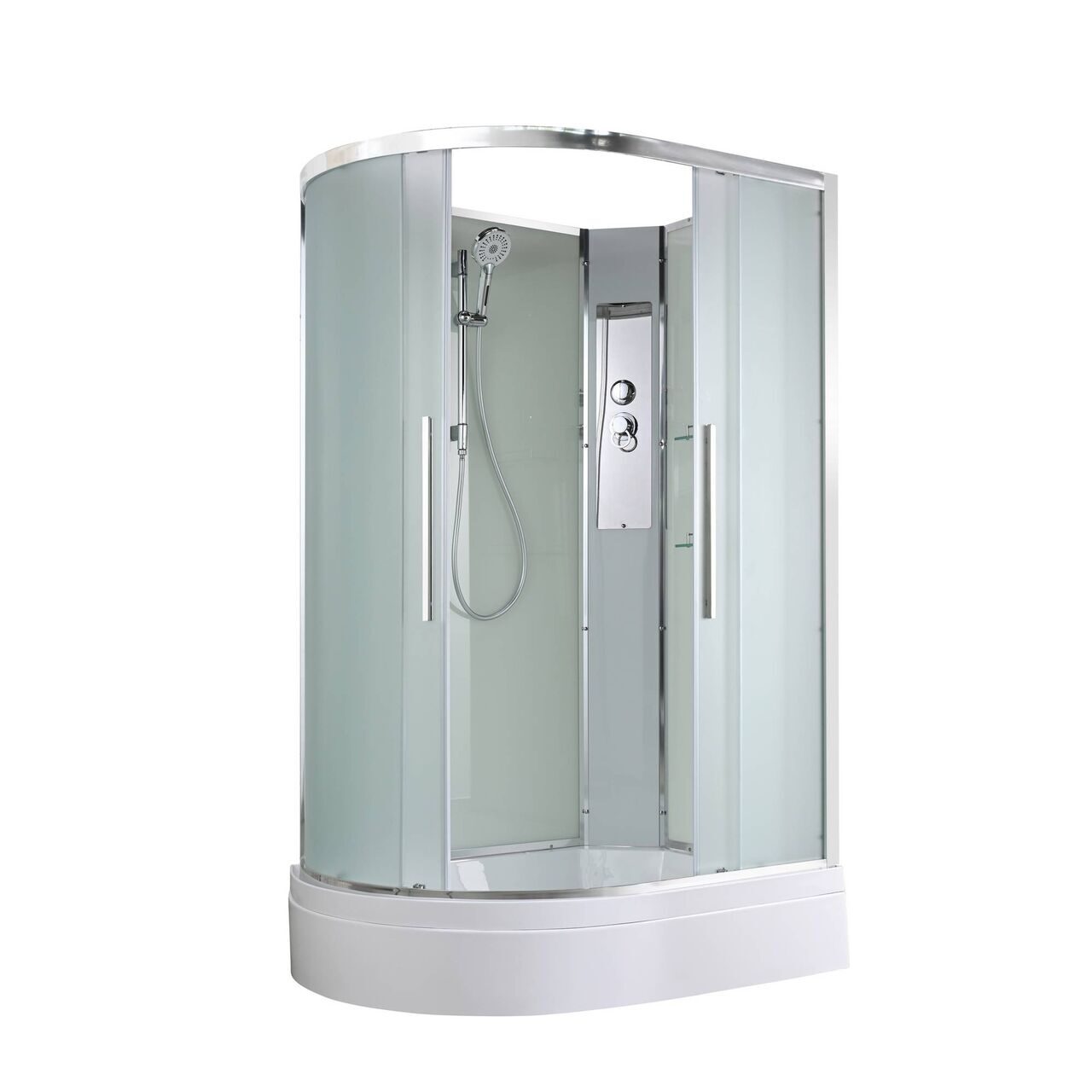 Оснащение Арома-лейка с витамином С / Душевая штанга / Переключатель режимов / Полимерная вставка в поддон / Полочки / Сифон / Смеситель