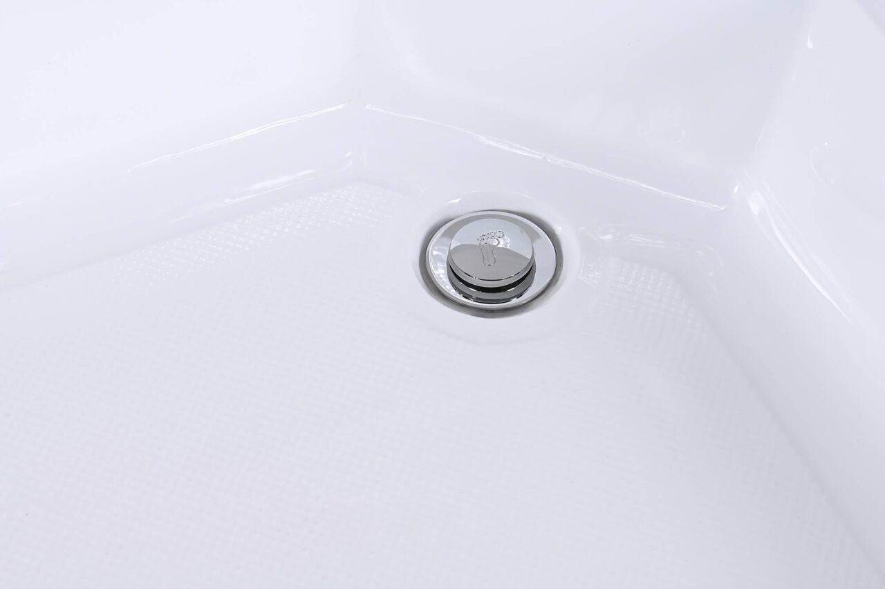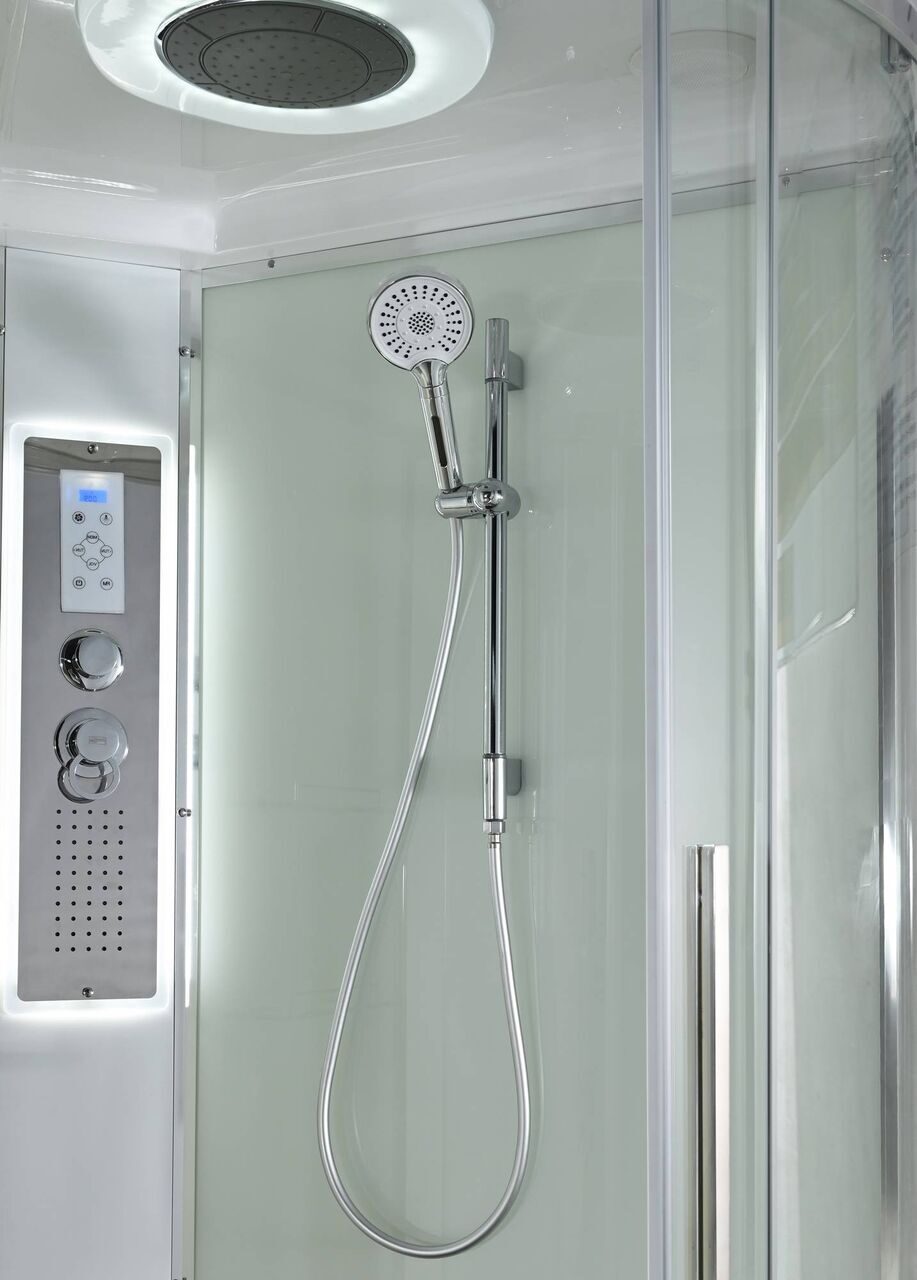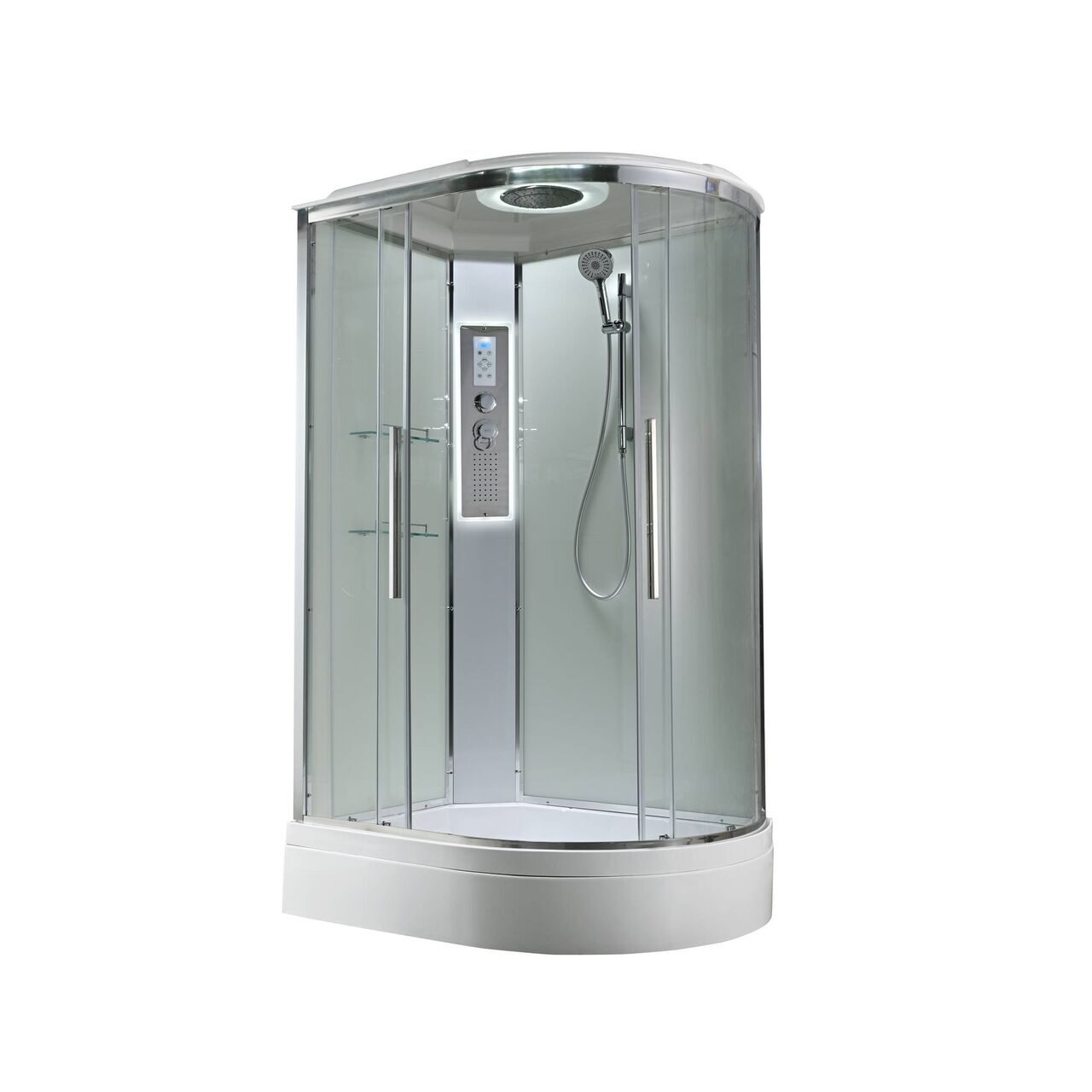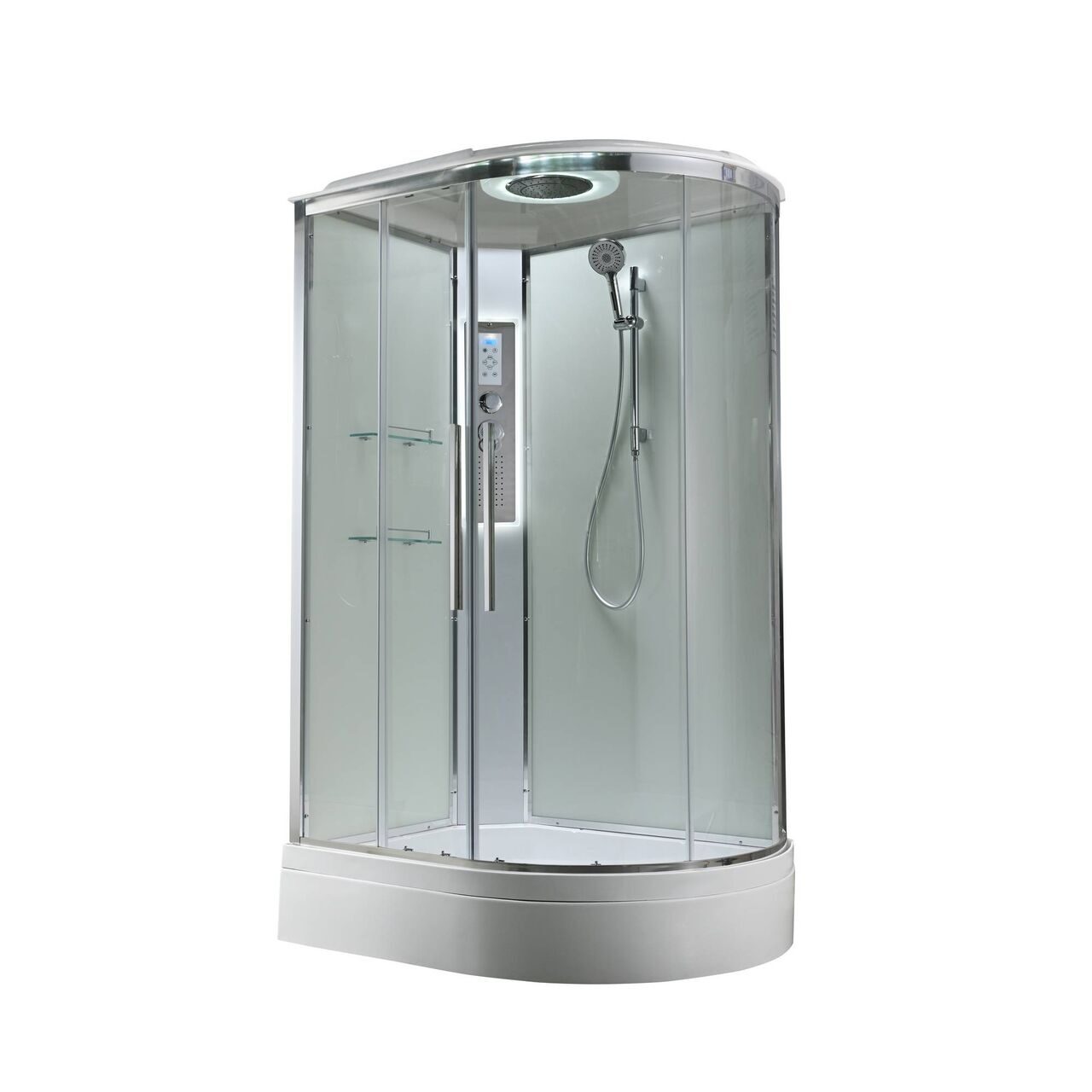 Оснащение bluetooth / LED-подсветка / Арома-лейка с витамином С / Вентиляция / Гидромассажные форсунки / Переключатель режимов / Полимерная вставка в поддон / Полочки / Радио / Сифон / Смеситель / Тропический (верхний) душ
