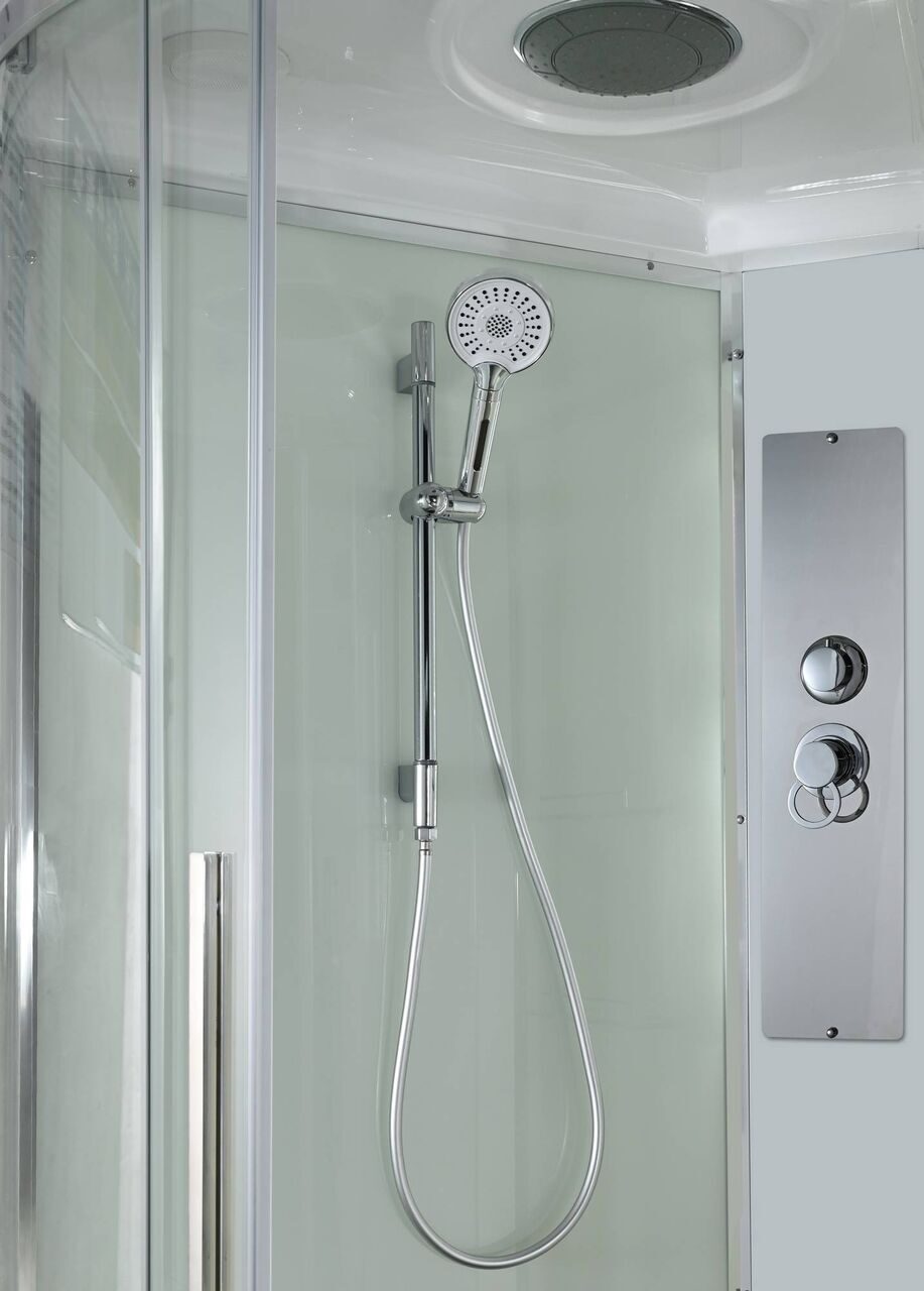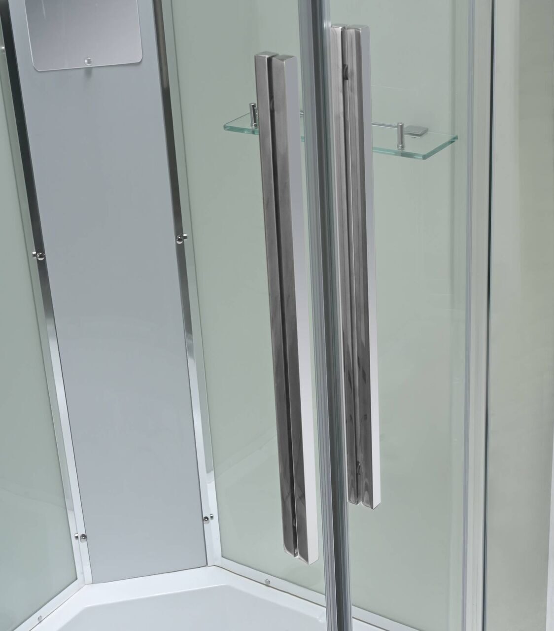 Стильная душевая кабина AvaCan сочетает в себе высокую функциональность, практичность и надежность. При изготовлении применяется безопасное закаленное стекло, надежно фиксируемое алюминиевым профилем. Профиль сделан из алюминия повышенной прочности. Сборка без силикона (увеличивает срок службы, защищает от протечек), внутренняя сборка (облегчает установку и ревизию; позволяет установить в ограниченном пространстве и обойтись без демонтажа других сантехнических приборов), смеситель резьбовой (без хомутов). Съемный экран поддона (позволяет осуществлять подключение и ревизию сифона). Двойные металлические ролики дверей (распределение нагрузки на два ролика, увеличивают срок службы). Душевая штанга (позволяет регулировать по высоте ручную лейку), ручная арома-лейка с витамином С (картридж в комплекте, есть возможность замены или удаления картриджа), полочки (из стекла, с ограничителем), сифон с гидрозатвором.