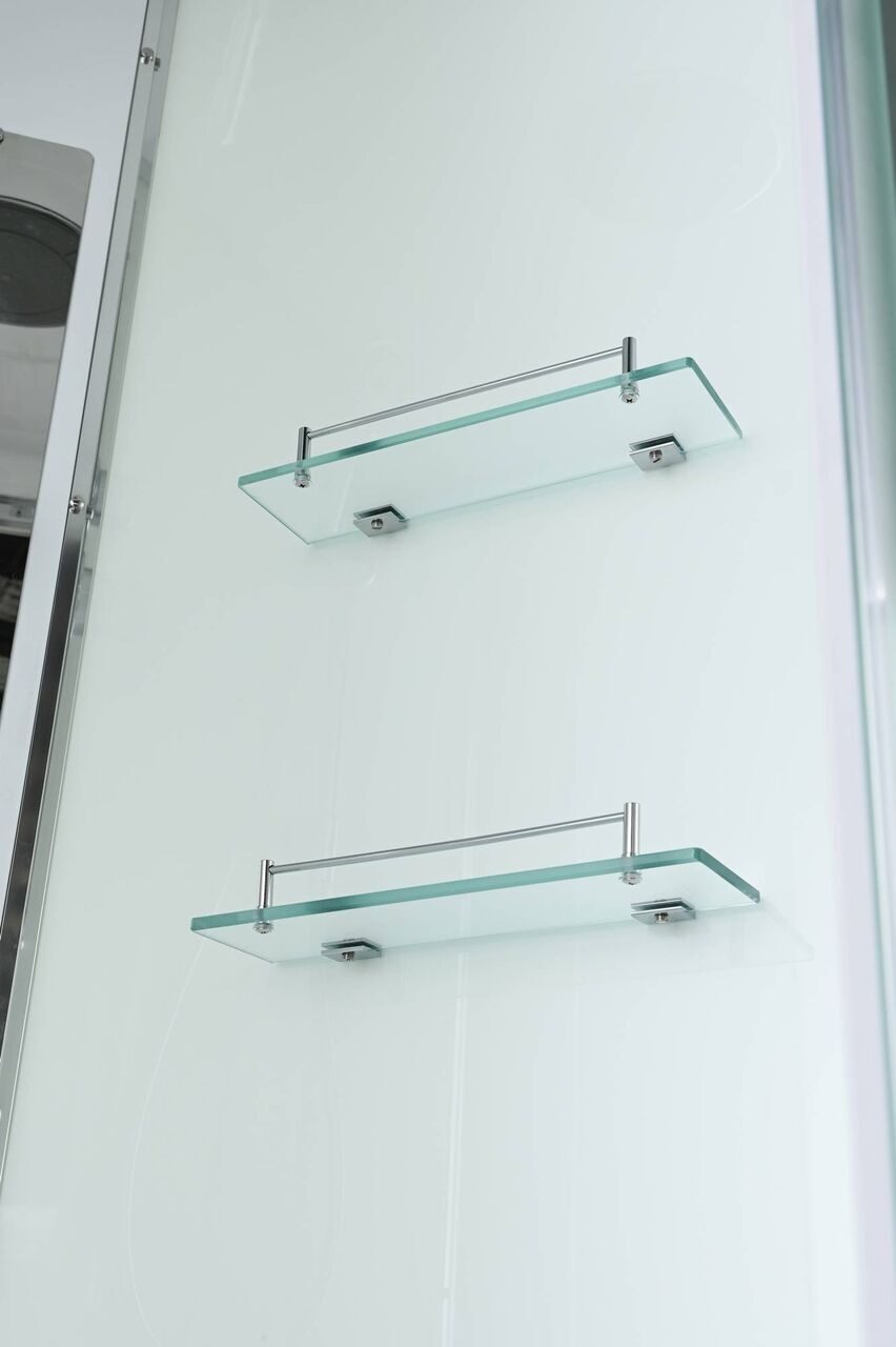 Оснащение Арома-лейка с витамином С / Душевая штанга / Переключатель режимов / Полимерная вставка в поддон / Полочки / Сифон / Смеситель / Тропический (верхний) душ