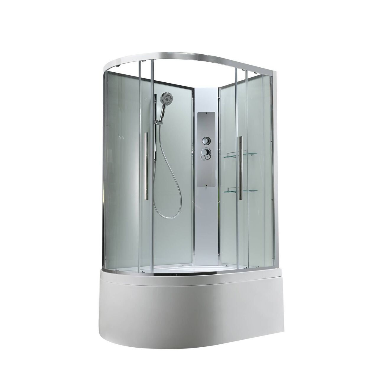 Оснащение Арома-лейка с витамином С / Душевая штанга / Переключатель режимов / Полимерная вставка в поддон / Полочки / Сифон / Смеситель