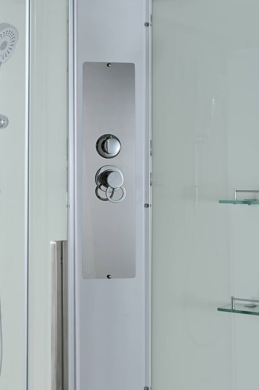 Оснащение Арома-лейка с витамином С / Душевая штанга / Переключатель режимов / Полимерная вставка в поддон / Полочки / Сифон / Смеситель