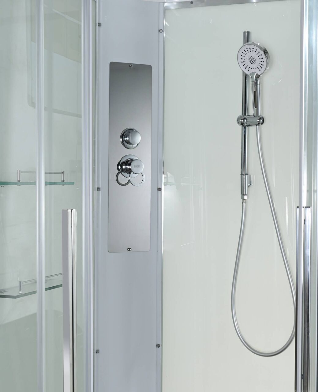 Оснащение Арома-лейка с витамином С / Душевая штанга / Переключатель режимов / Полимерная вставка в поддон / Полочки / Сифон / Смеситель