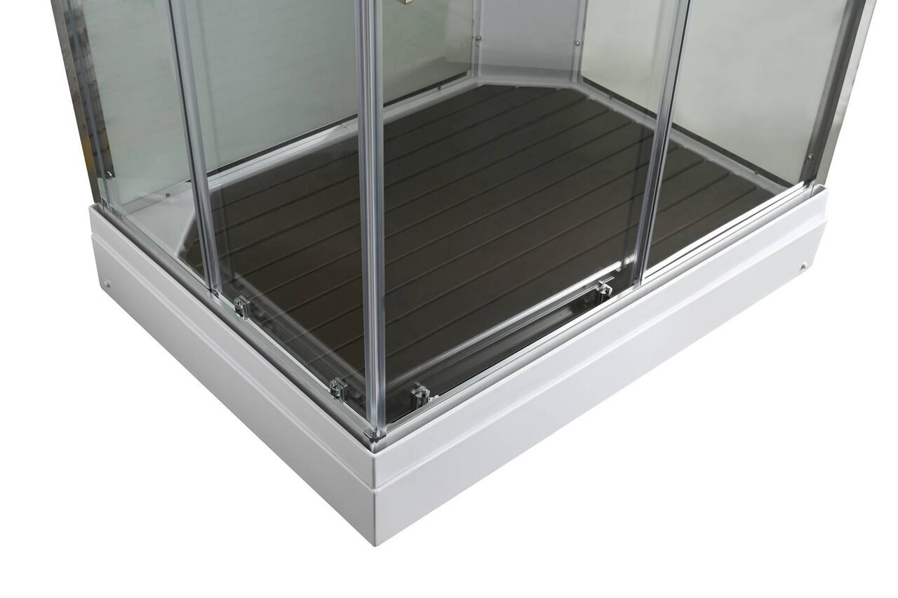 Оснащение Арома-лейка с витамином С / Душевая штанга / Переключатель режимов / Полимерная вставка в поддон / Полочки / Сифон / Смеситель / Тропический (верхний) душ