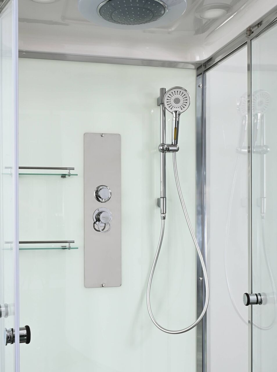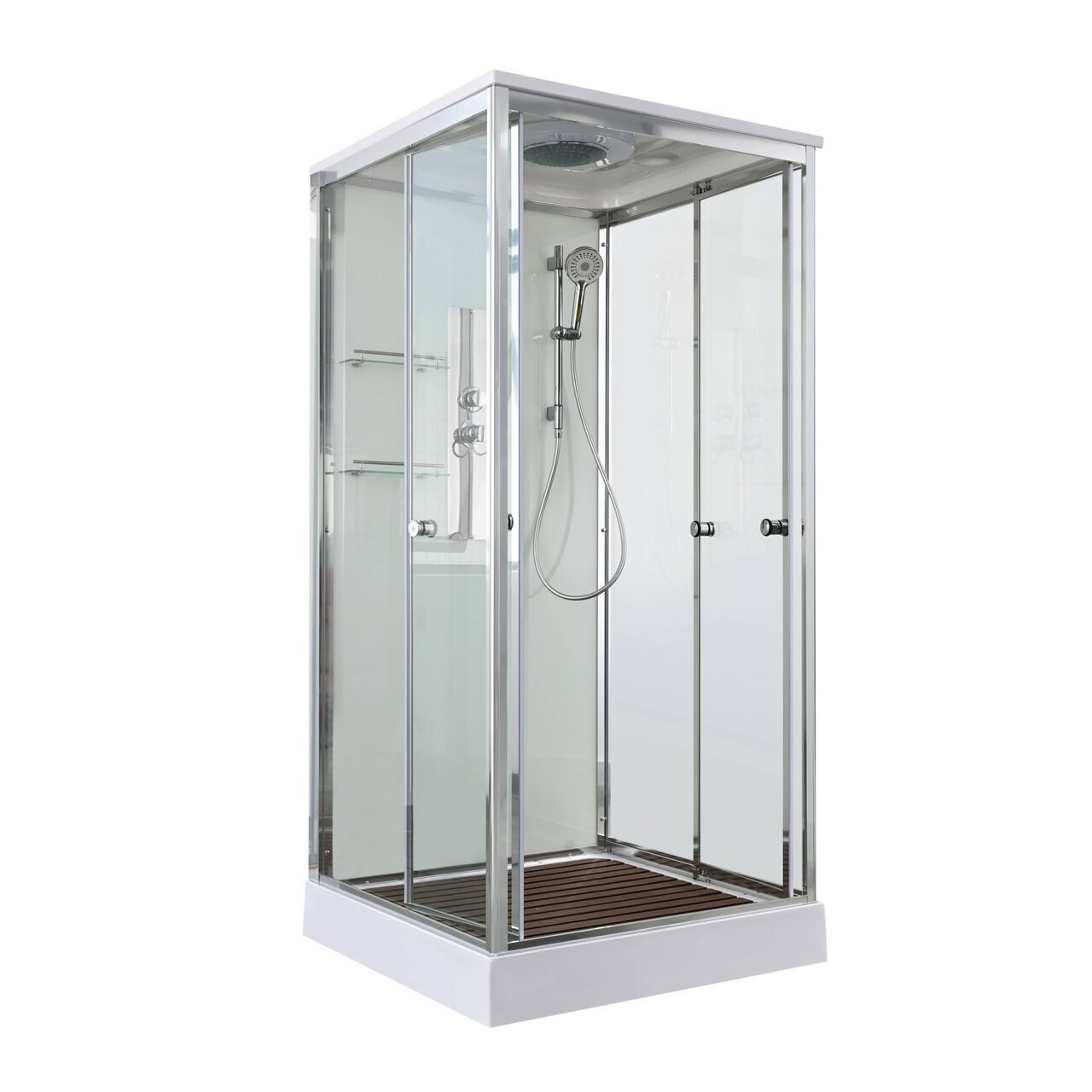 Оснащение Арома-лейка с витамином С / Душевая штанга / Переключатель режимов / Полимерная вставка в поддон / Полочки / Сифон / Смеситель / Тропический (верхний) душ