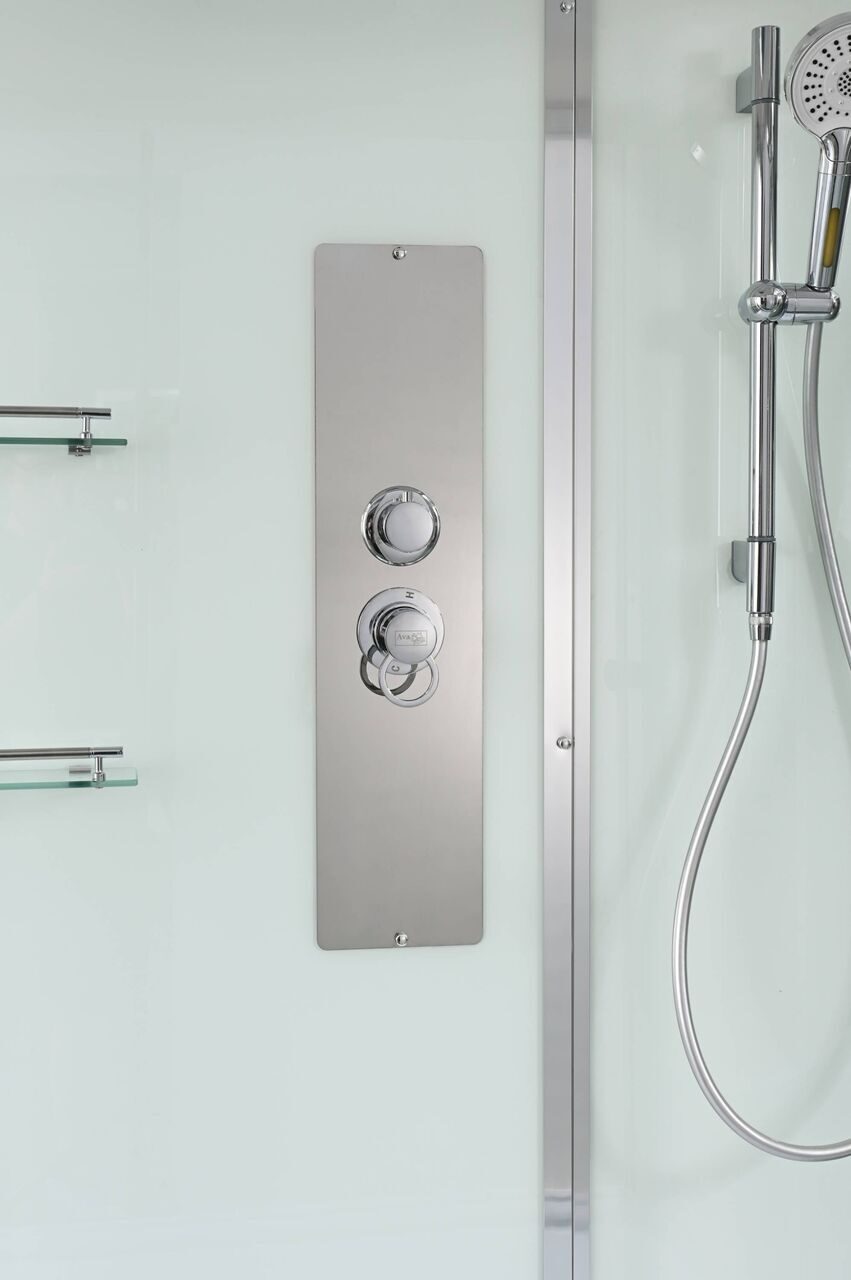 Оснащение Арома-лейка с витамином С / Душевая штанга / Переключатель режимов / Полимерная вставка в поддон / Полочки / Сифон / Смеситель / Тропический (верхний) душ