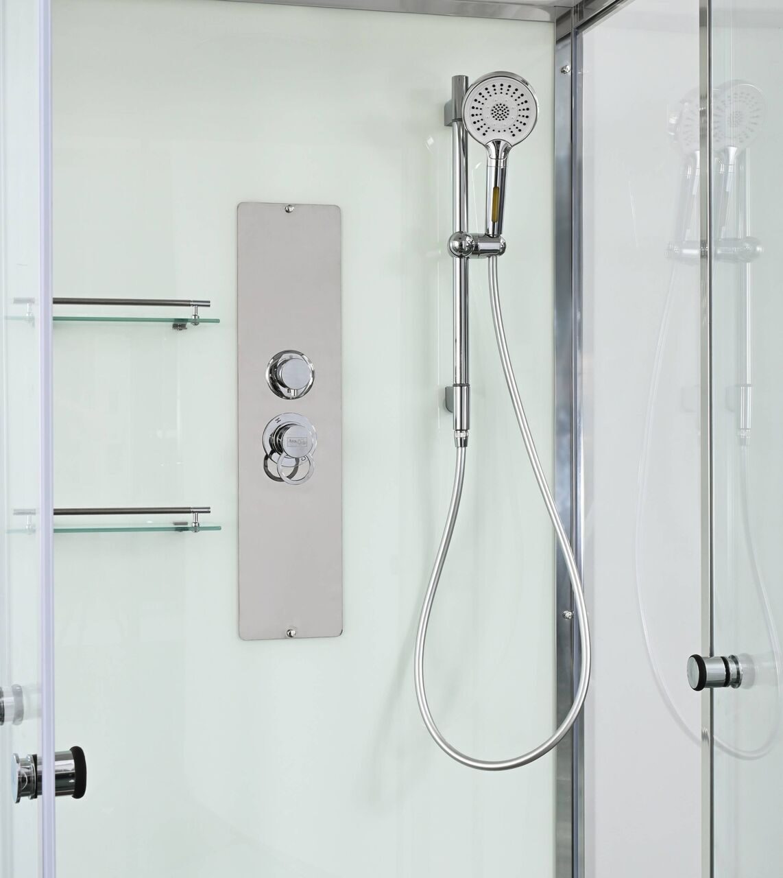 Оснащение Арома-лейка с витамином С / Душевая штанга / Переключатель режимов / Полимерная вставка в поддон / Полочки / Сифон / Смеситель