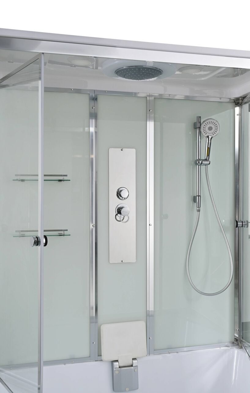 Оснащение Арома-лейка с витамином С / Душевая штанга / Переключатель режимов / Полочки / Сифон / Смеситель / Тропический (верхний) душ