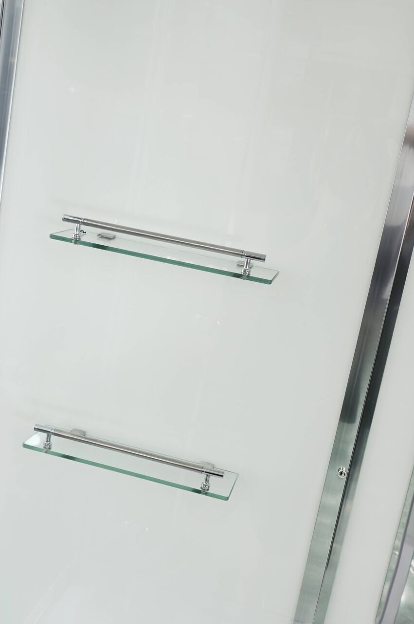 Оснащение Арома-лейка с витамином С / Душевая штанга / Переключатель режимов / Полочки / Сифон / Смеситель / Тропический (верхний) душ