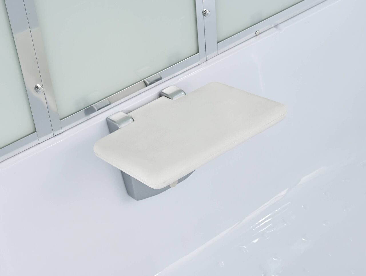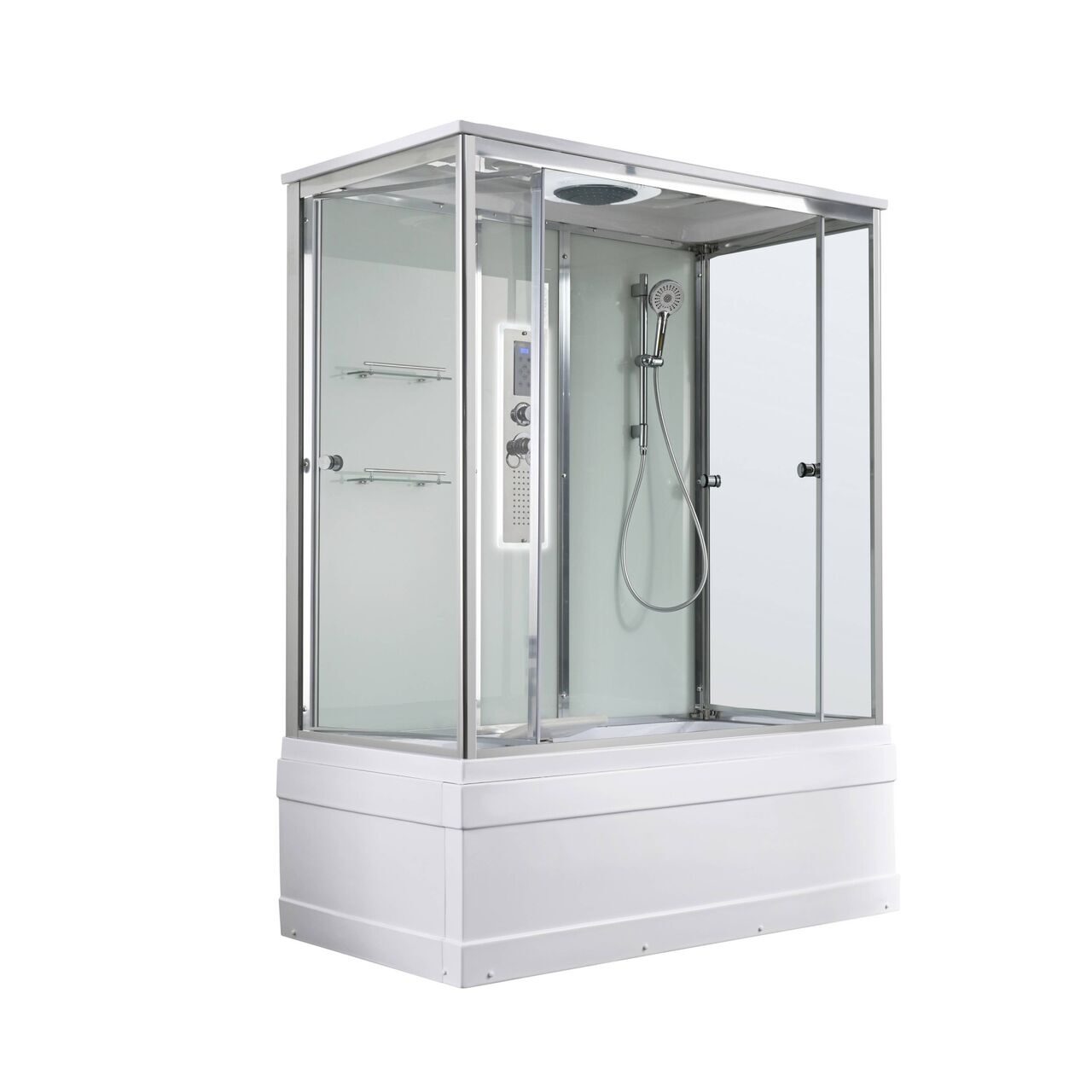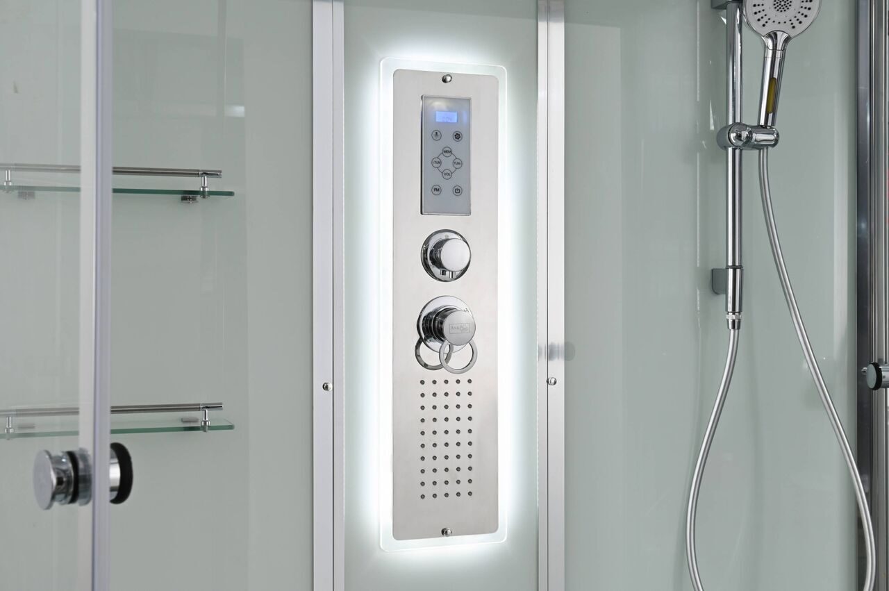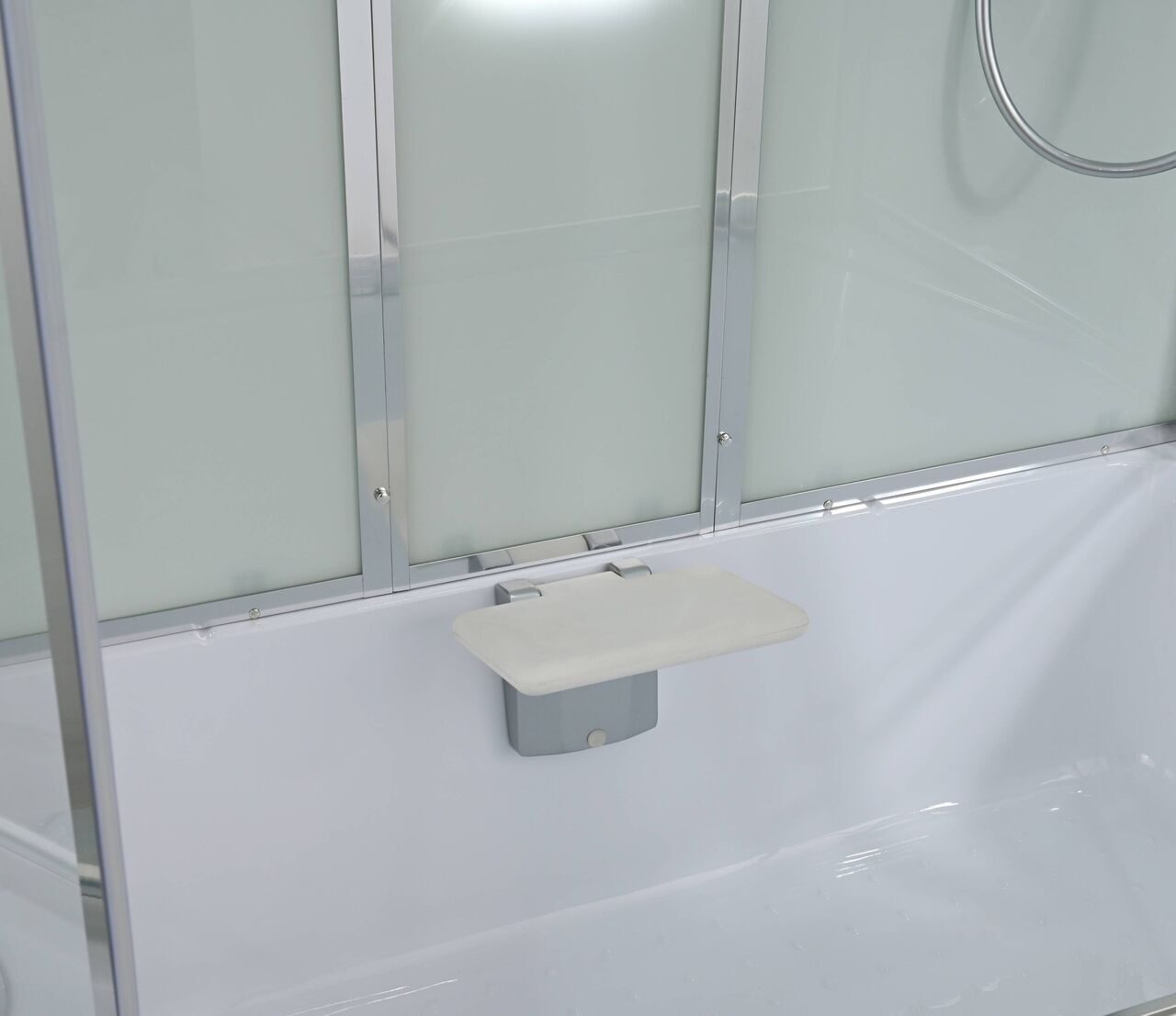 Оснащение bluetooth / LED-подсветка / Арома-лейка с витамином С / Вентиляция / Гидромассажные форсунки / Душевая штанга / Переключатель режимов / Полочки / Радио / Сифон / Смеситель / Тропический (верхний) душ