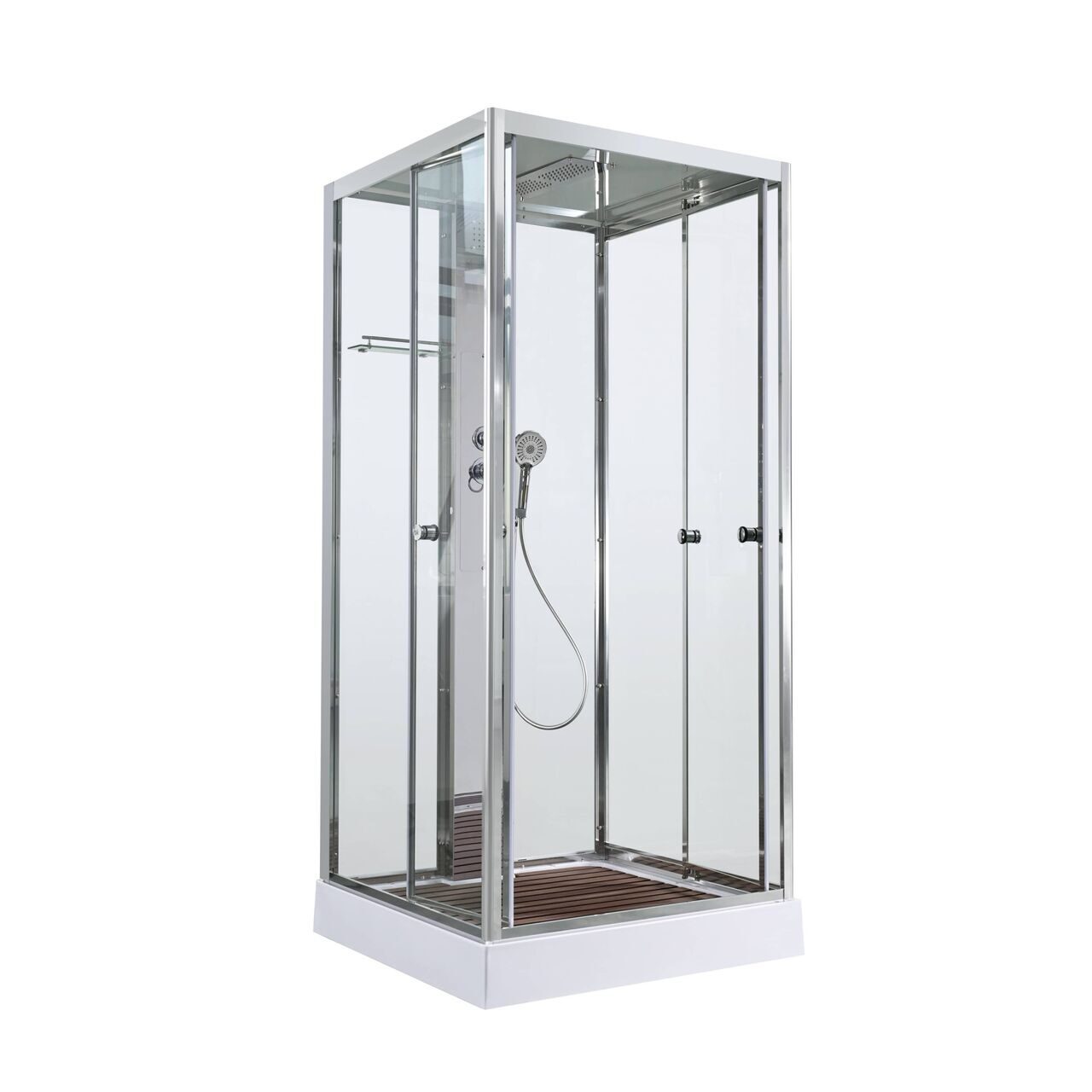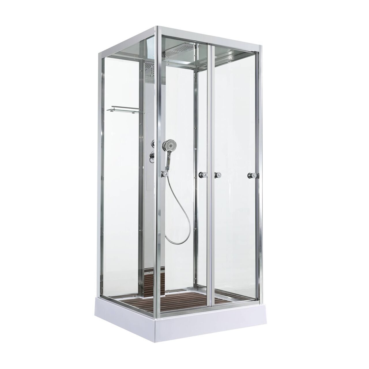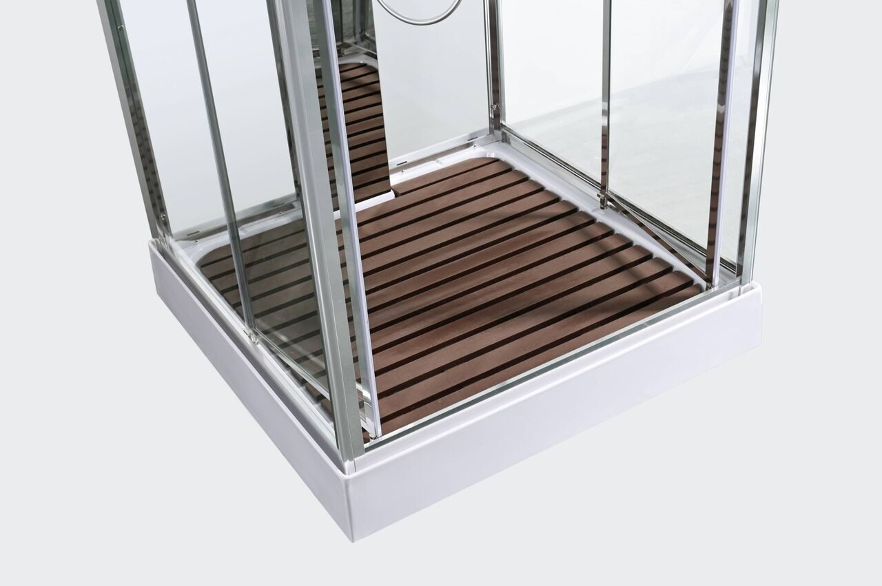 Оснащение Арома-лейка с витамином С / Душевая штанга / Переключатель режимов / Полимерная вставка в поддон / Полочки / Сифон / Смеситель / Тропический (верхний) душ