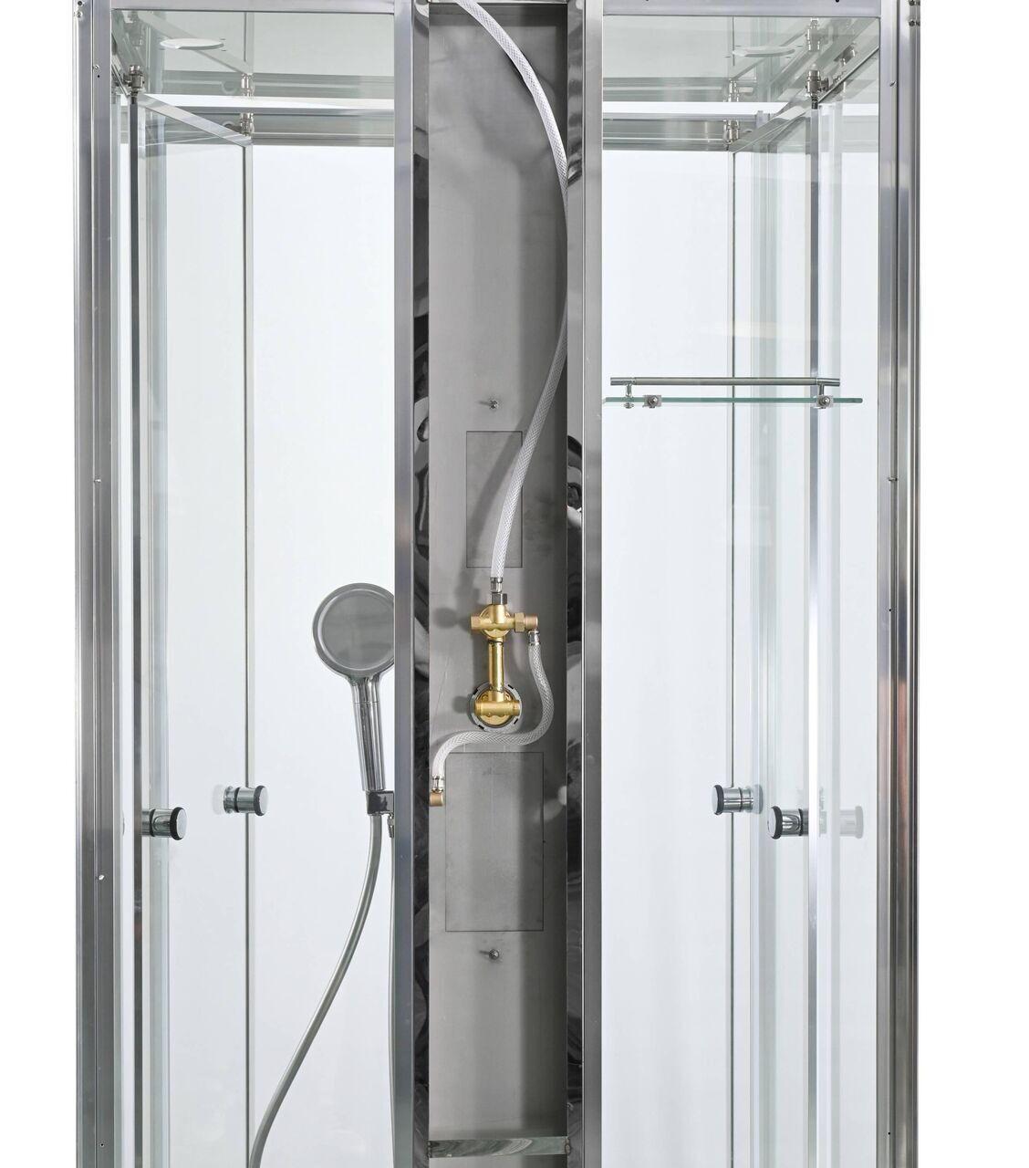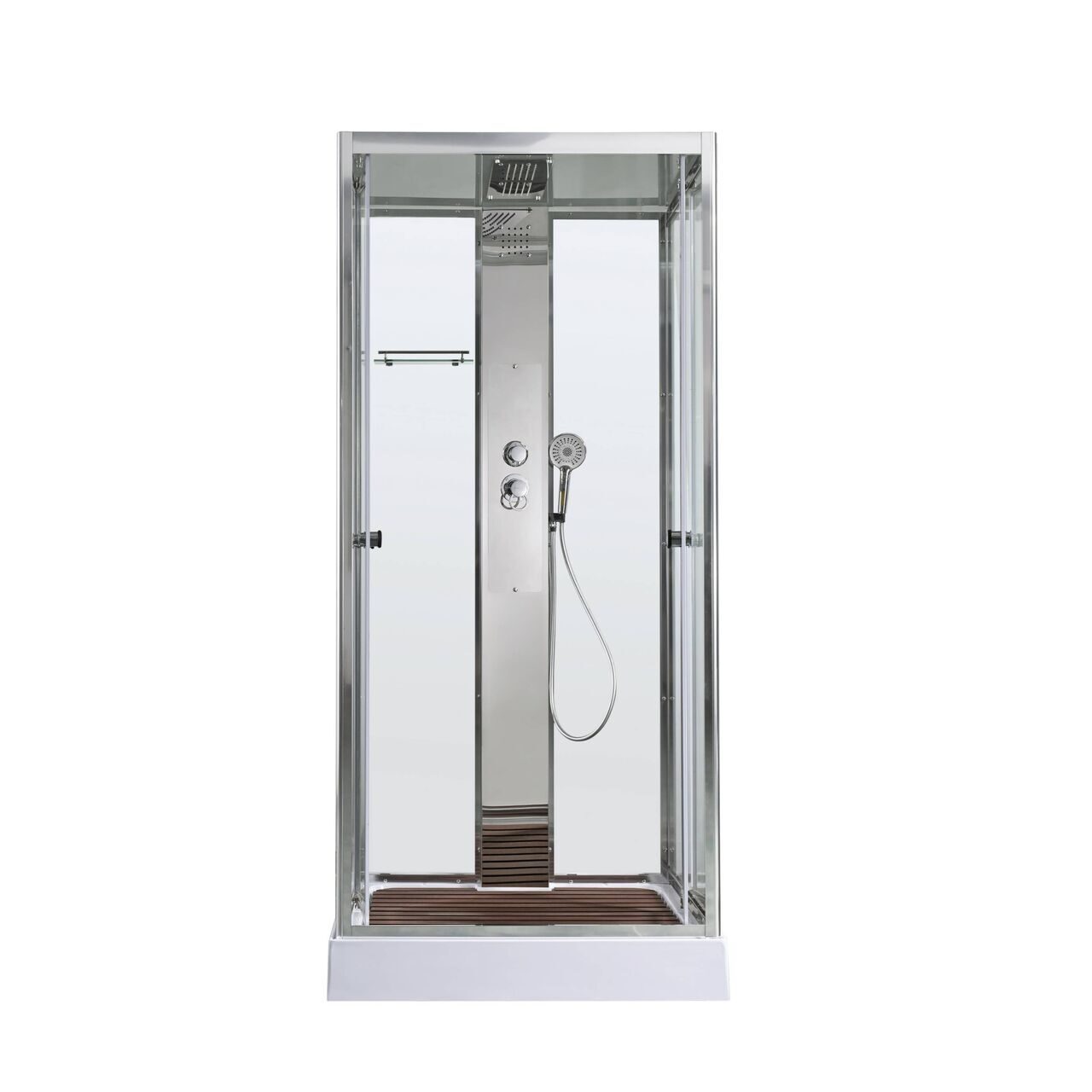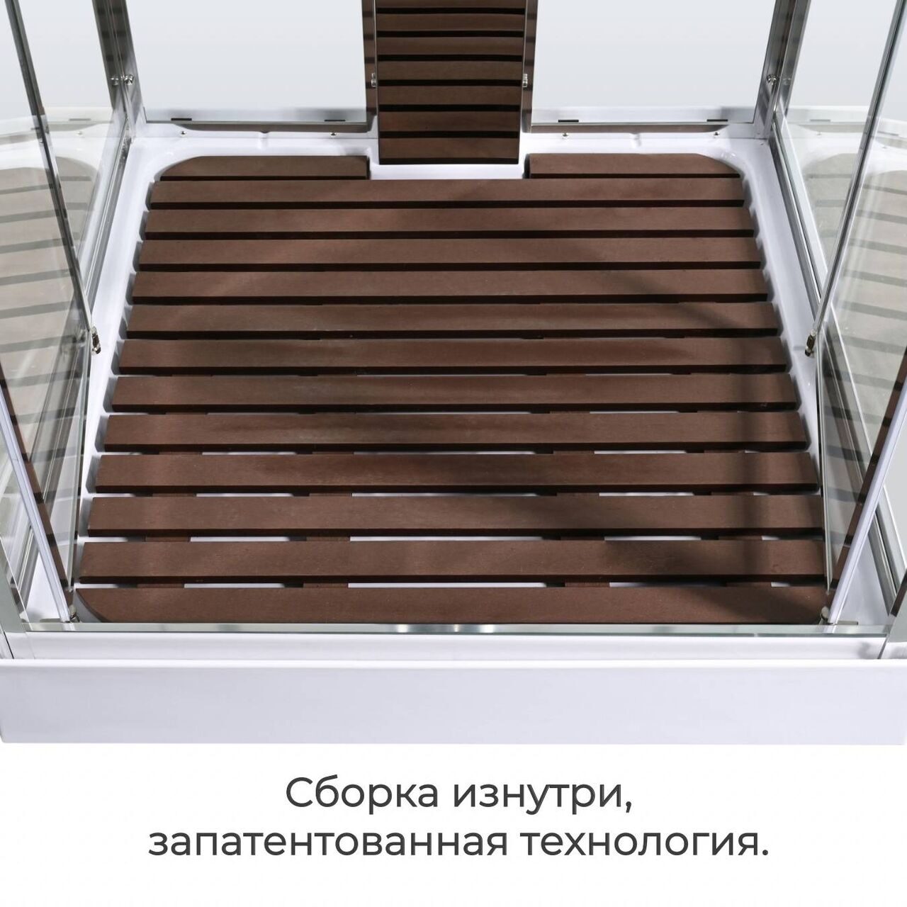 Оснащение Арома-лейка с витамином С / Душевая штанга / Переключатель режимов / Полимерная вставка в поддон / Полочки / Сифон / Смеситель / Тропический (верхний) душ