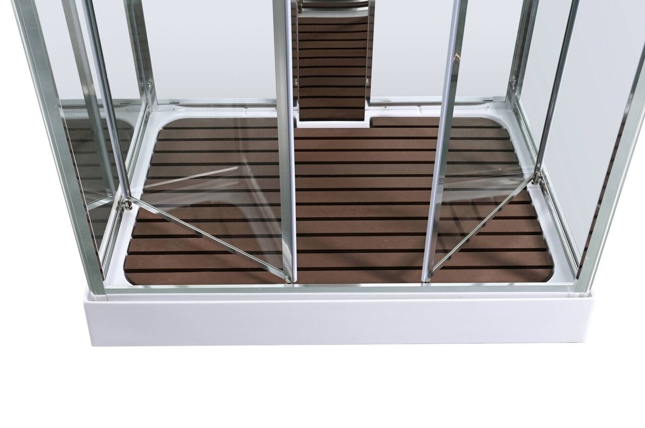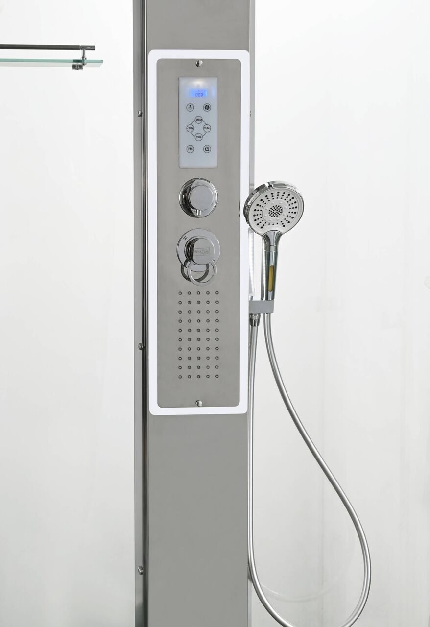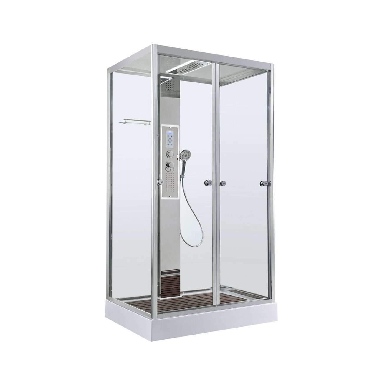 Оснащение bluetooth / LED-подсветка / Арома-лейка с витамином С / Вентиляция / Гидромассажные форсунки / Душевая штанга / Переключатель режимов / Полочки / Радио / Сифон / Смеситель / Тропический (верхний) душ