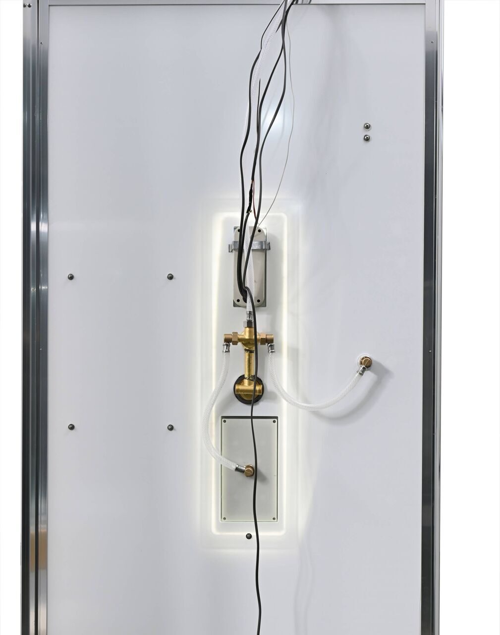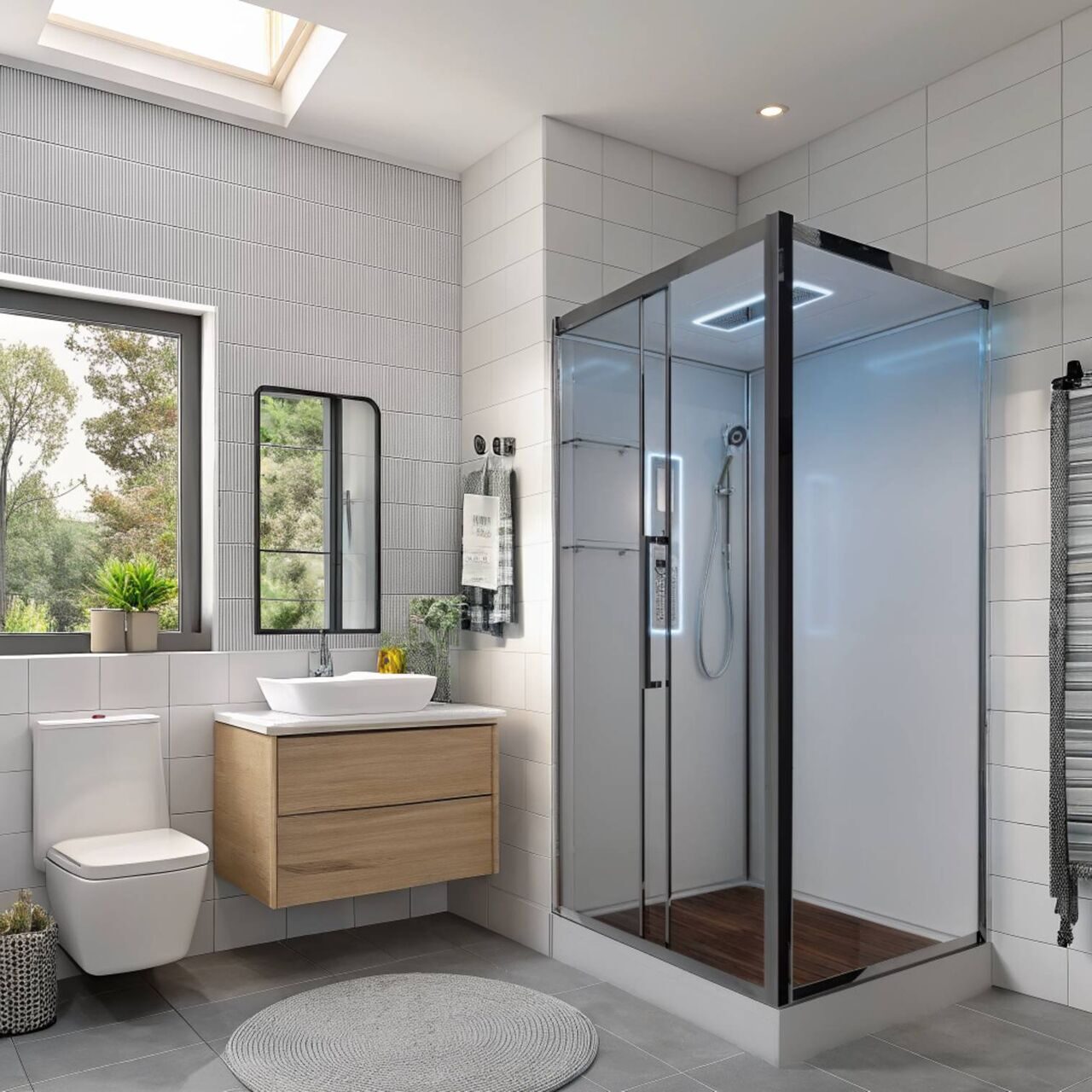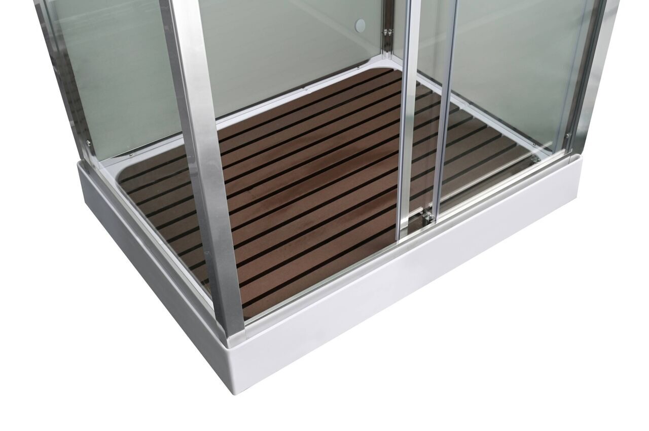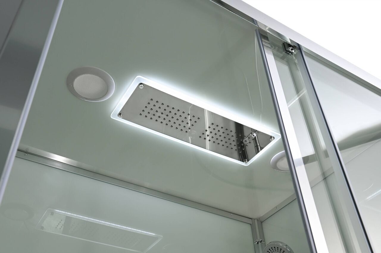 Оснащение bluetooth / LED-подсветка / Арома-лейка с витамином С / Вентиляция / Гидромассажные форсунки / Душевая штанга / Переключатель режимов / Полочки / Радио / Сифон / Смеситель / Тропический (верхний) душ