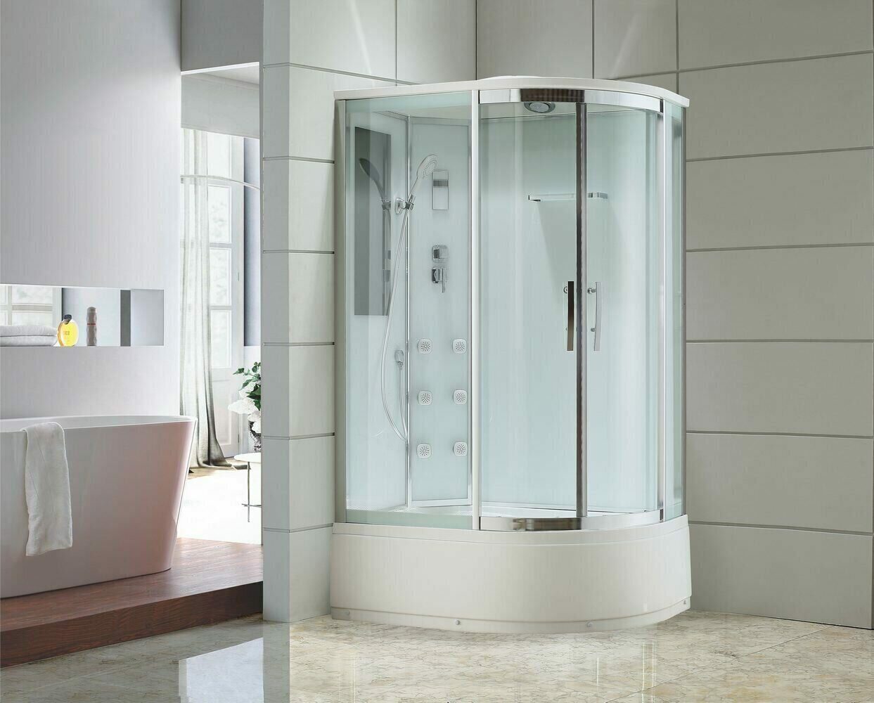 Стильная душевая кабина Black&White G5507 L сочетает в себе высокую функциональность, практичность и надежность. Для изготовления применяют безопасное закаленное стекло толщиной 5 мм, надежно фиксируемое алюминиевым профилем. Цвет профиля хром. В комплекте смеситель, душевой гарнитур, полочка, зеркало, тропический (верхний) душ, вентиляция, радио, bluetooth, led-подсветка, гидромассажные форсунки.