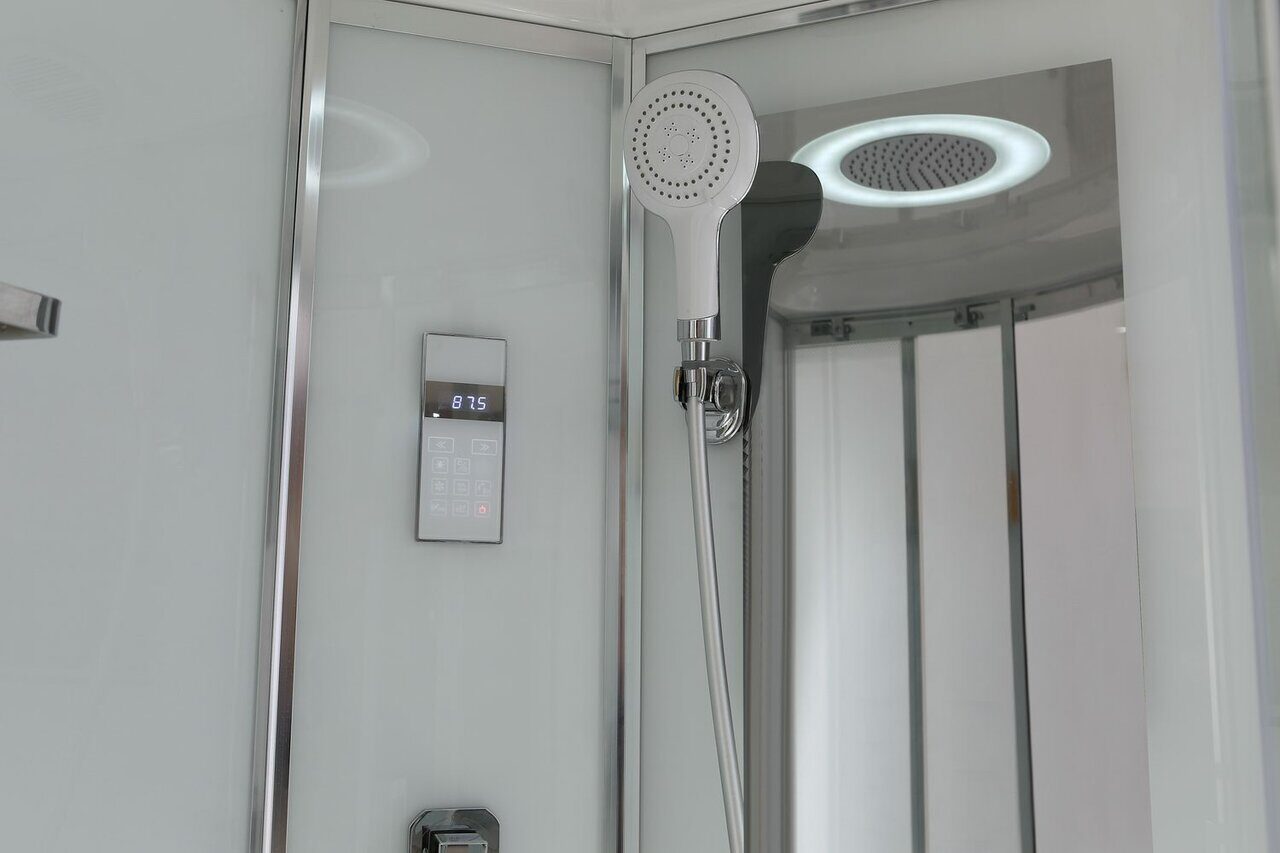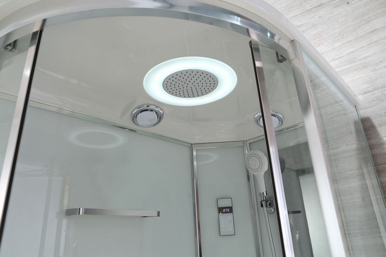 Оснащение bluetooth / LED-подсветка / Вентиляция / Гидромассажные форсунки / Душевой гарнитур / Зеркало / Полочка / Радио / Смеситель / Тропический (верхний) душ
