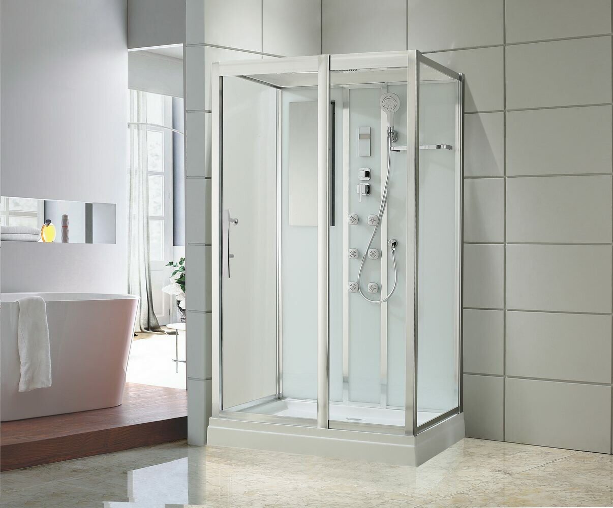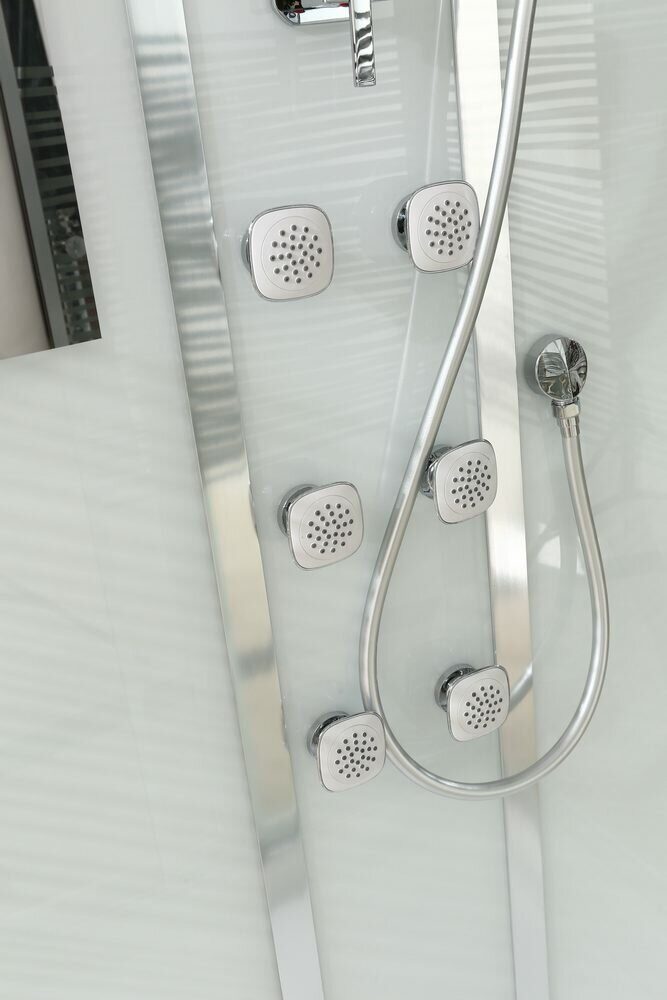 Оснащение bluetooth / LED-подсветка / Вентиляция / Гидромассажные форсунки / Душевой гарнитур / Зеркало / Полочка / Радио / Смеситель / Тропический (верхний) душ
