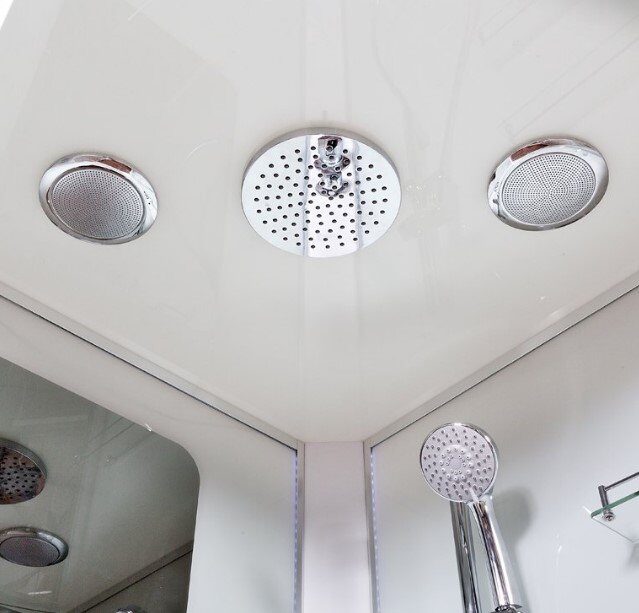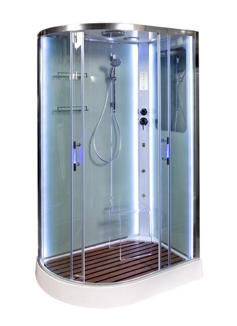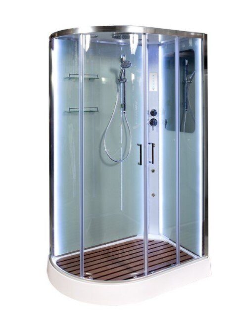 Оснащение LED-подсветка / Вентиляция / Душевой гарнитур / Зеркало / Полочки / Радио / Сенсорный пульт управления / Сифон / Тропический (верхний) душ