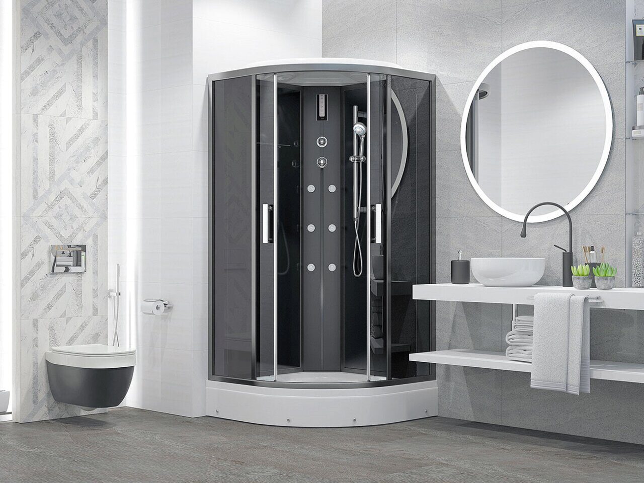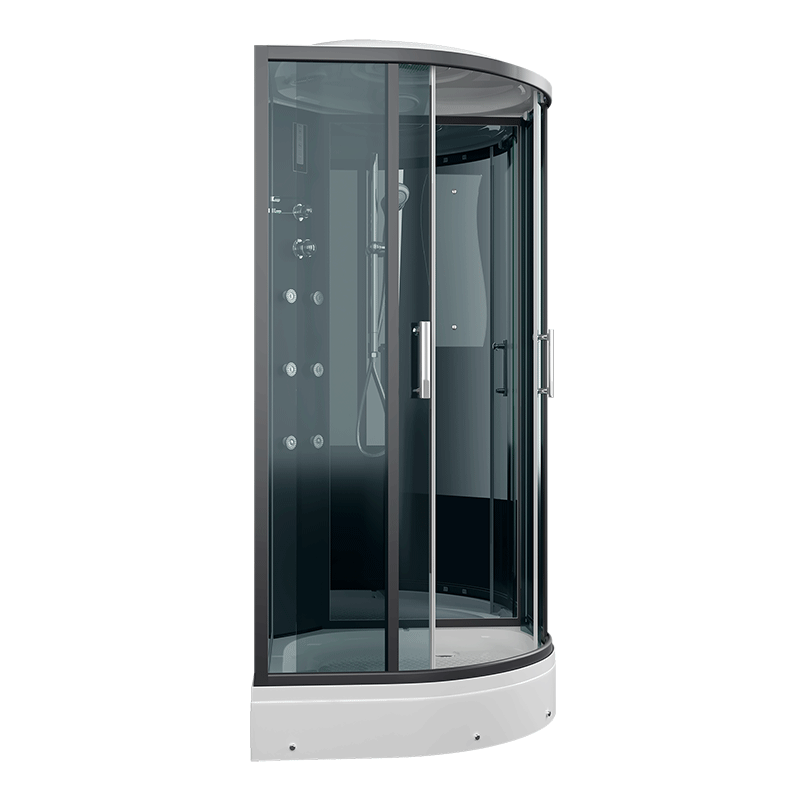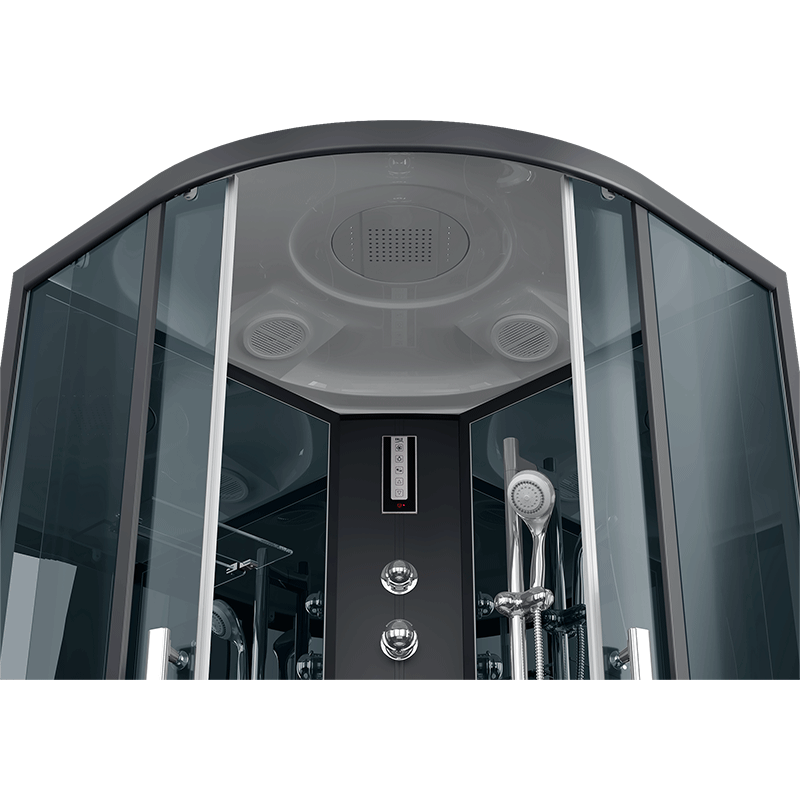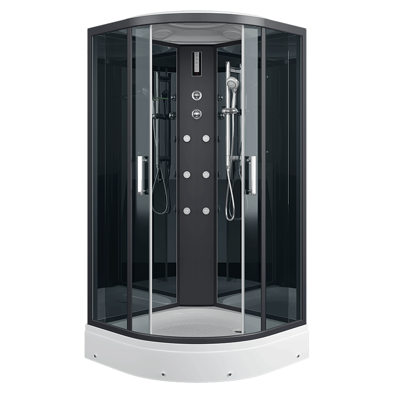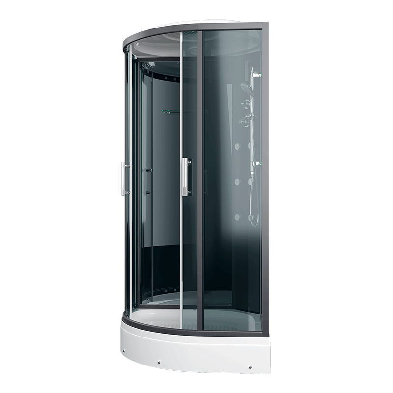 Оснащение Вентиляция / Гидромассажные форсунки / Душевой гарнитур / Зеркало / Подсветка / Полочка / Радио / Сенсорный пульт управления / Тропический (верхний) душ / Часы