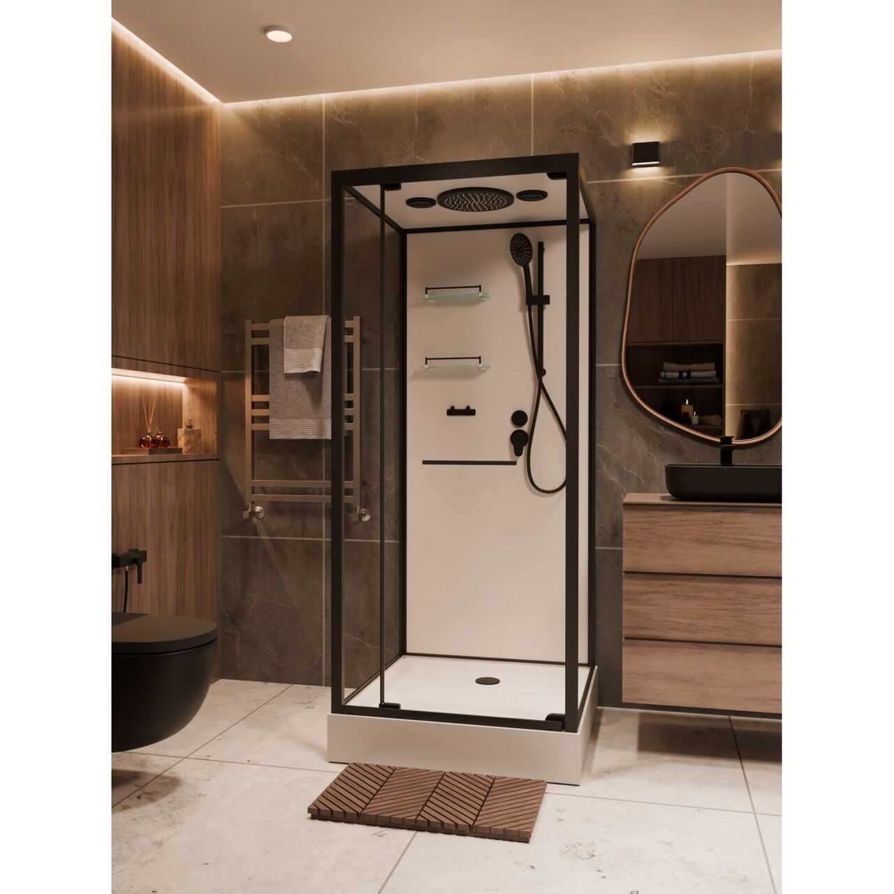 Оснащение Душевой гарнитур / Полочка / Сифон / Смеситель / Тропический (верхний) душ