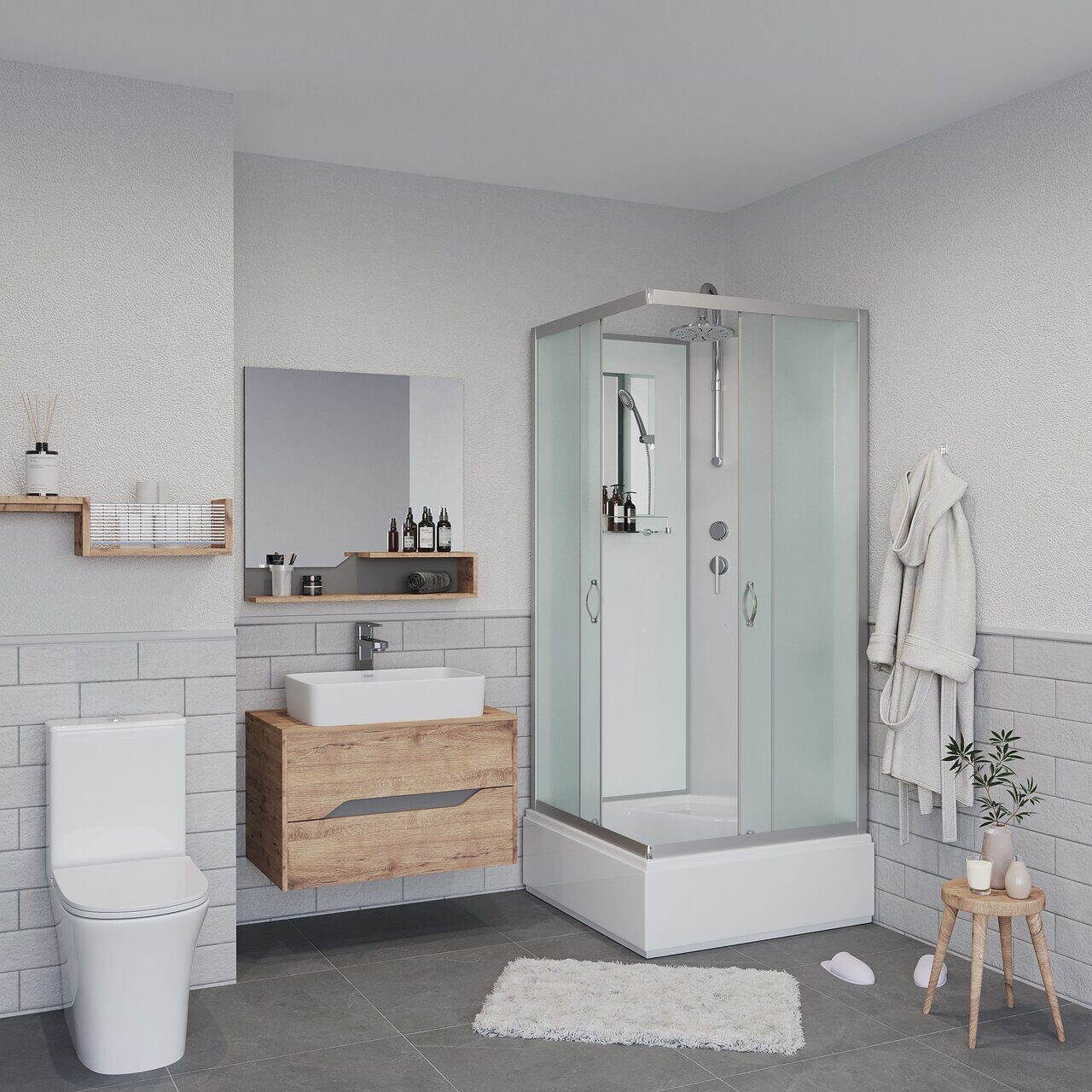 Оснащение Встроенное сиденье / Душевой гарнитур / Зеркало / Полочка / Тропический (верхний) душ