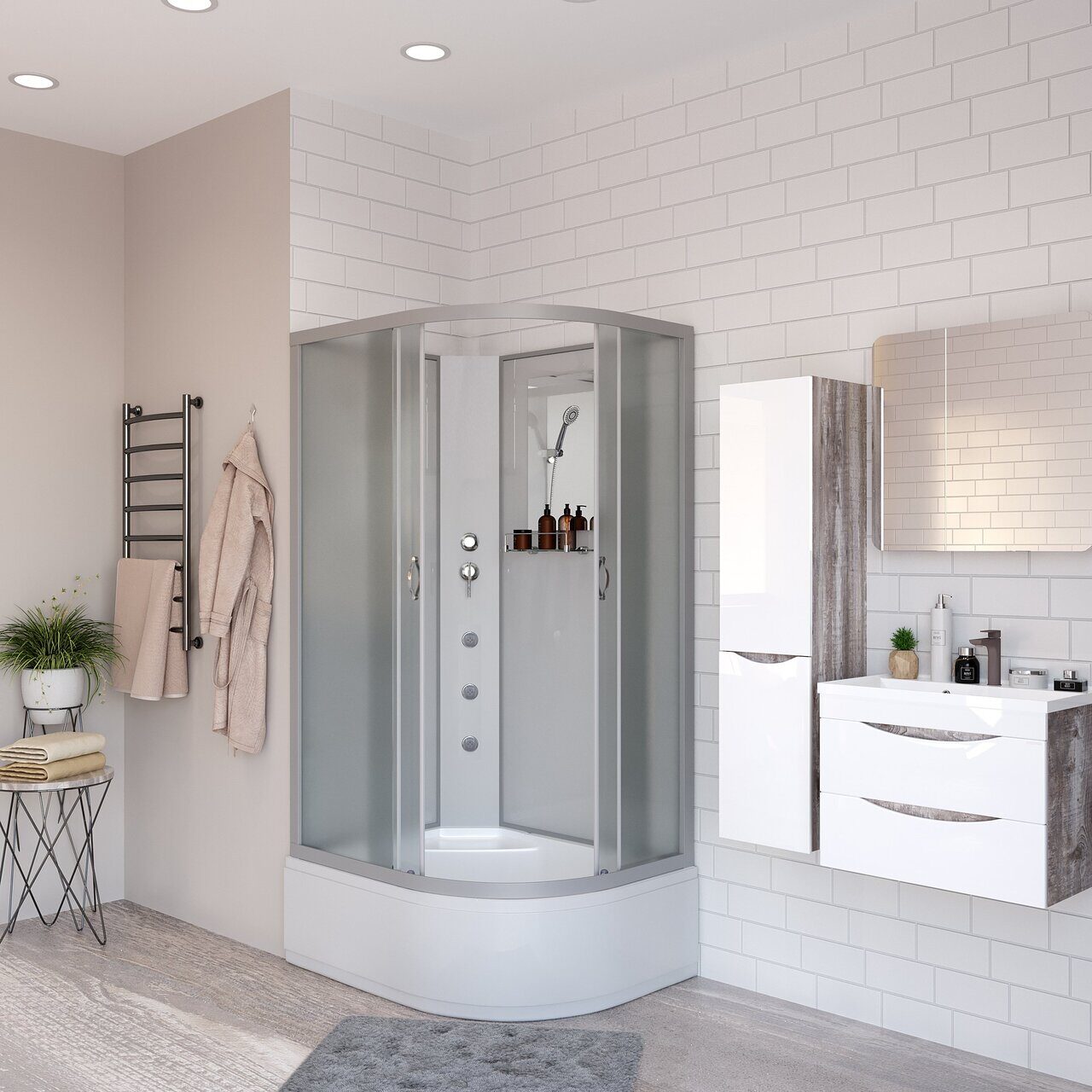 Оснащение Встроенное сиденье / Душевой гарнитур / Зеркало / Полочка