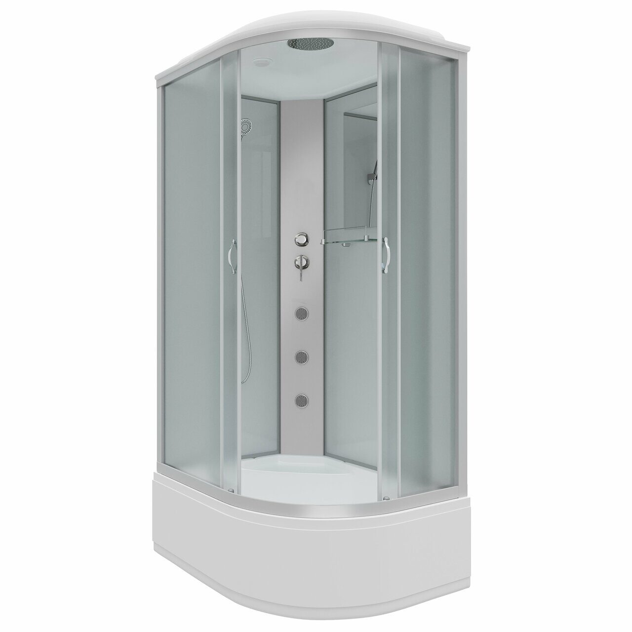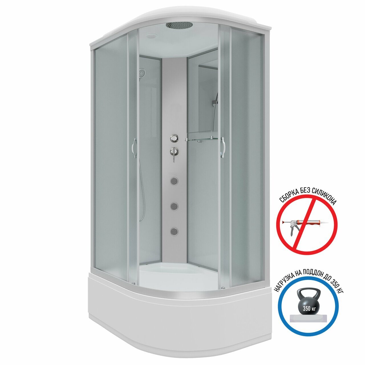 Оснащение Встроенное сиденье / Душевой гарнитур / Зеркало / Полочка / Тропический (верхний) душ
