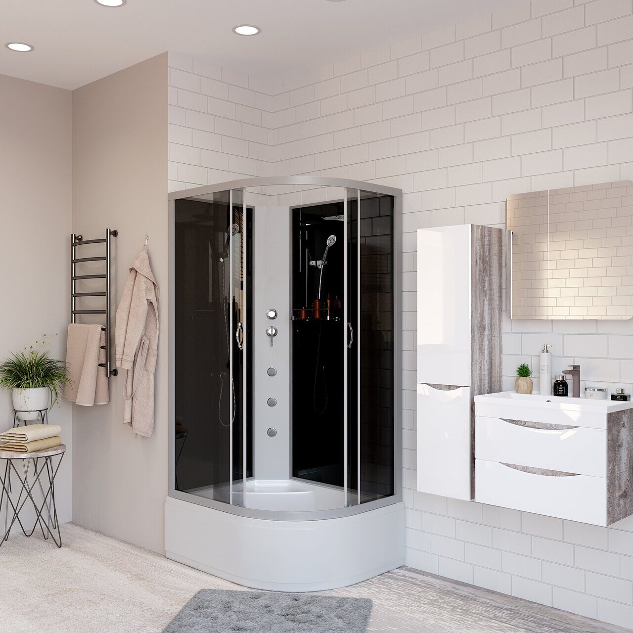 Оснащение Встроенное сиденье / Душевой гарнитур / Зеркало / Полочка