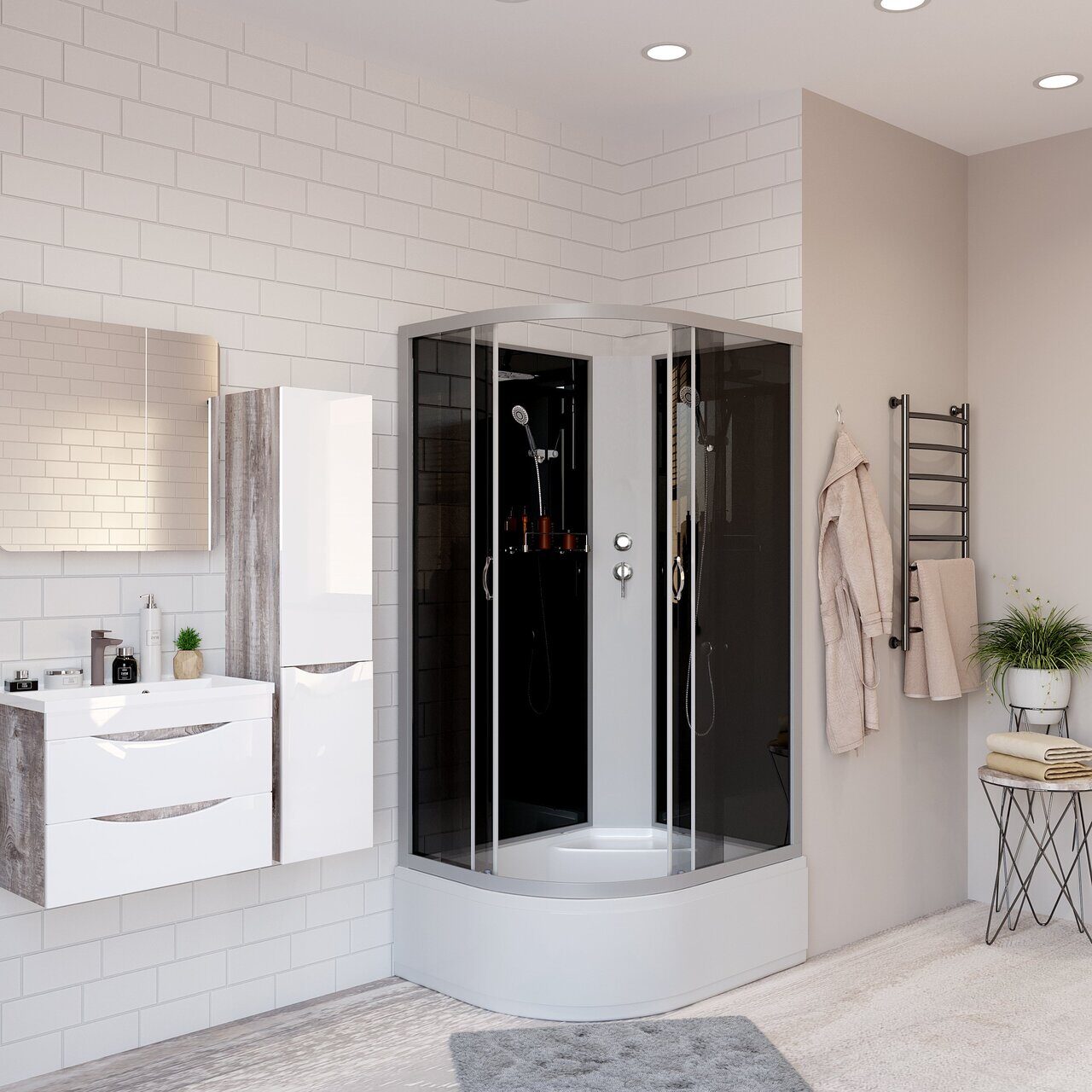 Оснащение Встроенное сиденье / Душевой гарнитур / Зеркало / Полочка
