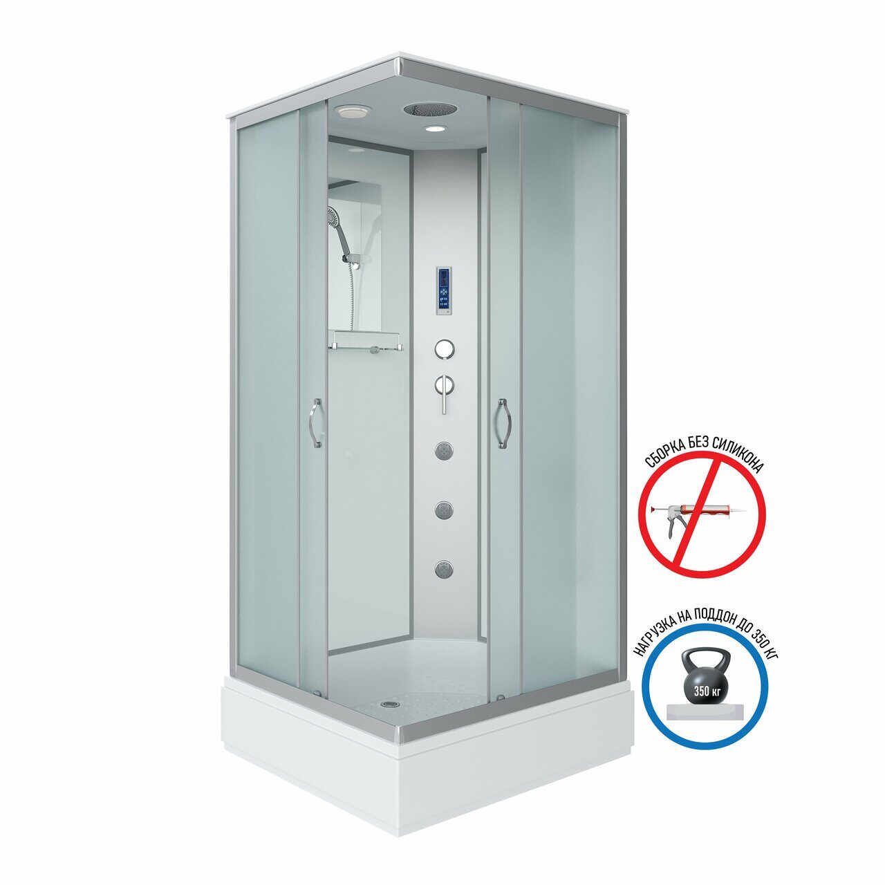 Оснащение LED-подсветка / Вентиляция / Душевой гарнитур / Зеркало / Полочка / Радио / Тропический (верхний) душ