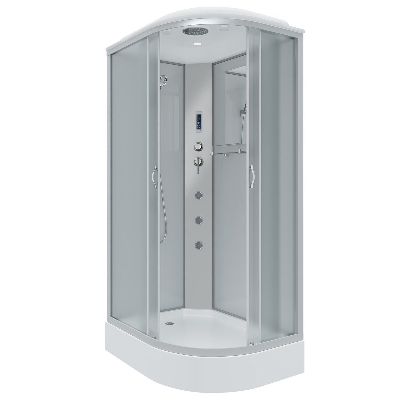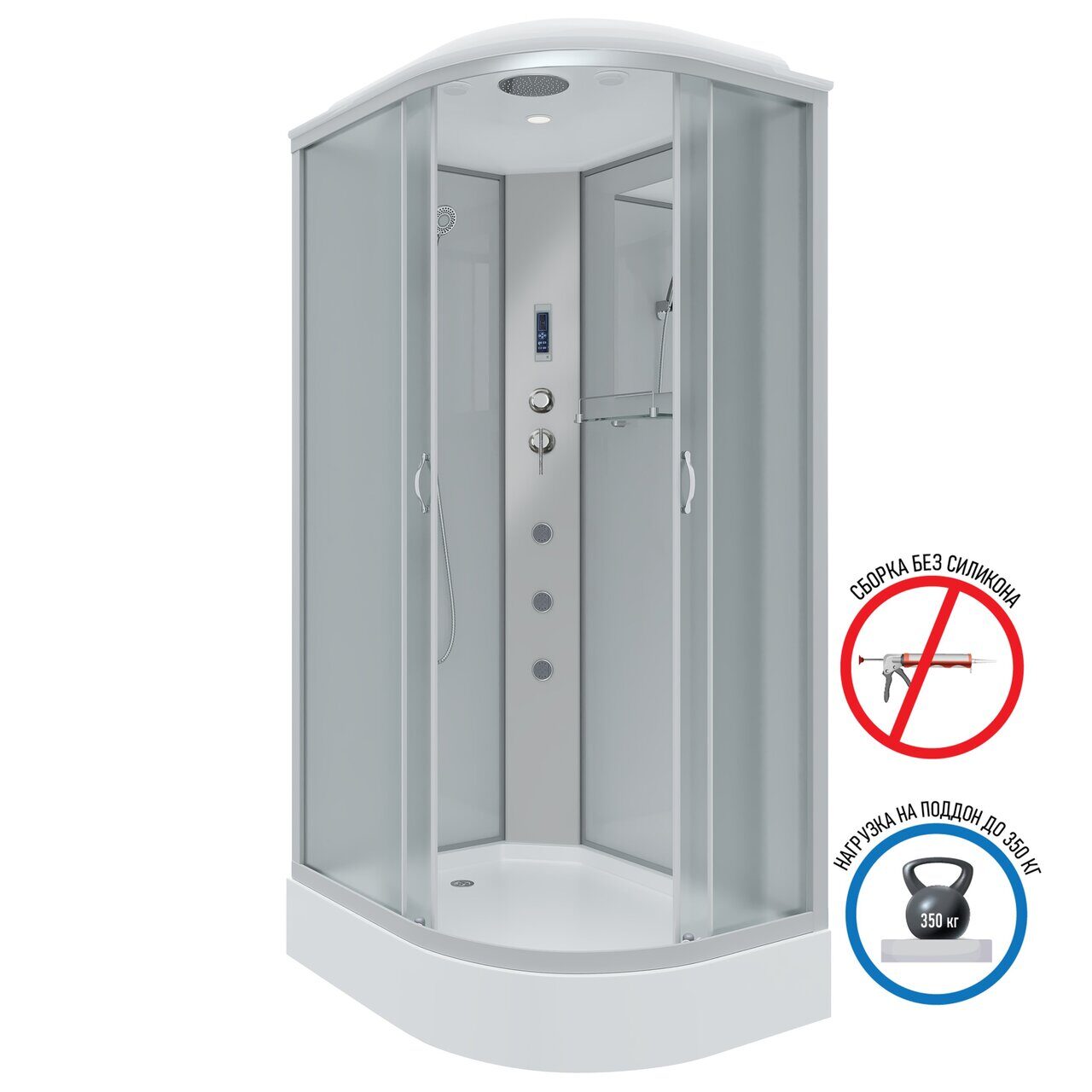 Оснащение LED-подсветка / Вентиляция / Душевой гарнитур / Зеркало / Полочка / Радио / Тропический (верхний) душ