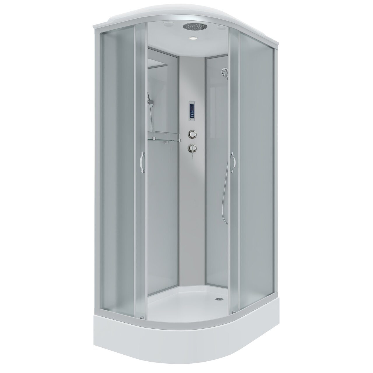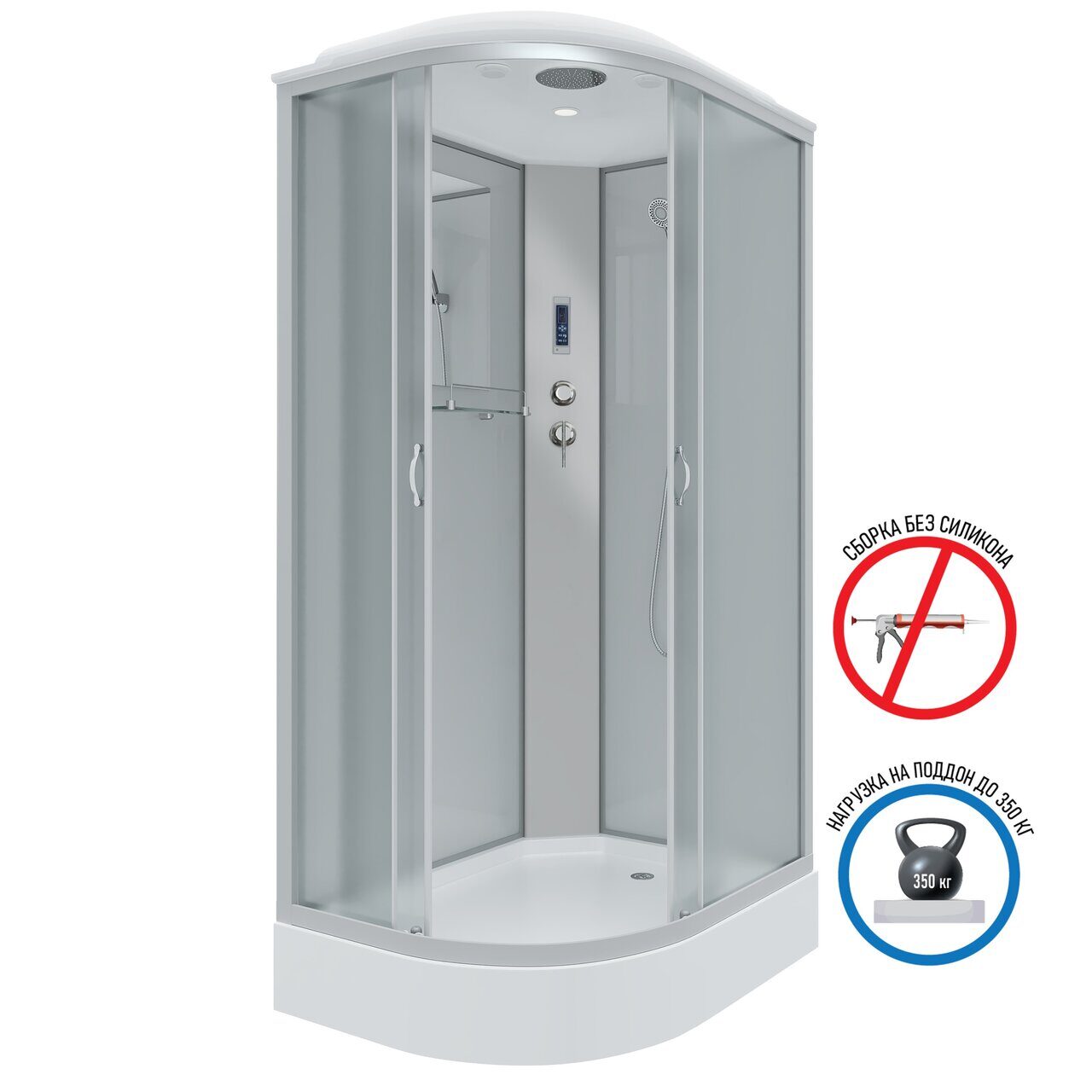 Оснащение LED-подсветка / Вентиляция / Душевой гарнитур / Зеркало / Полочка / Радио / Тропический (верхний) душ