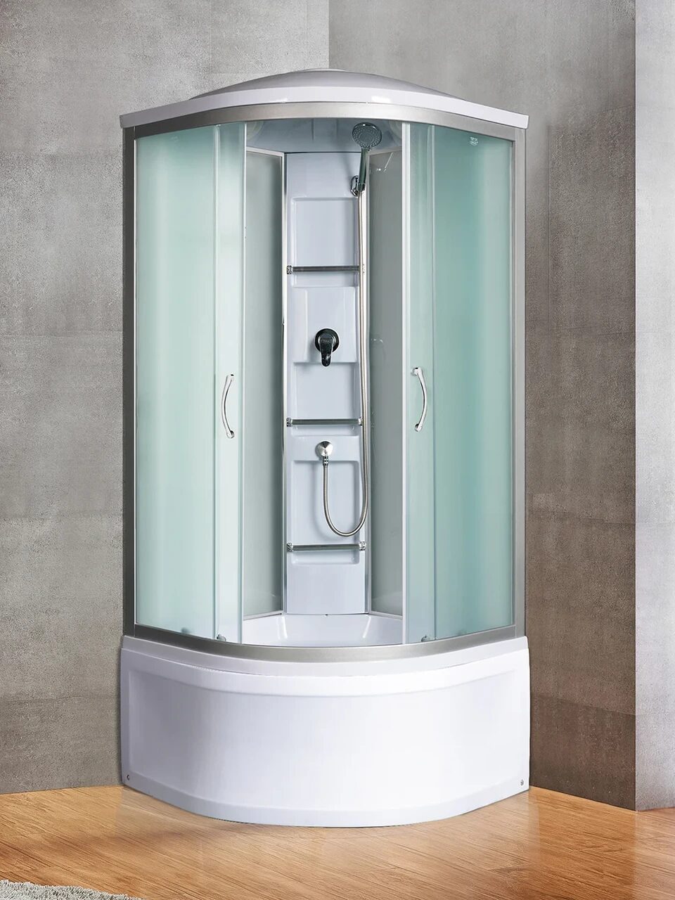 Оснащение Встроенное сиденье / Душевой гарнитур / Передний съемный экран / Переключатель режимов / Полочки / Сифон / Смеситель / Тропический (верхний) душ
