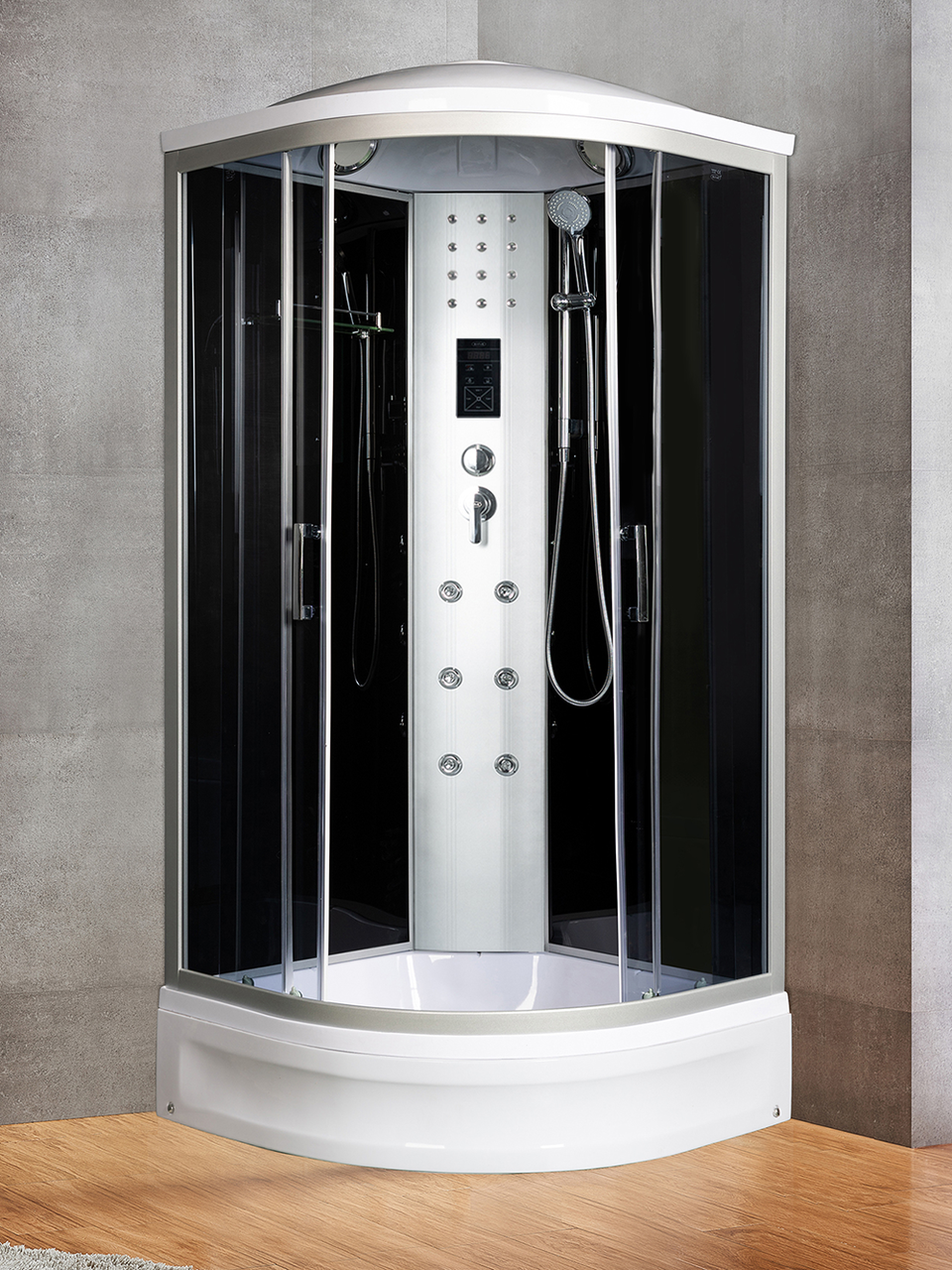 Оснащение Вентиляция / Гидромассажные форсунки / Душевой гарнитур / Передний съемный экран / Переключатель режимов / Полочка / Радио / Сенсорный пульт управления / Сифон / Смеситель / Тропический (верхний) душ