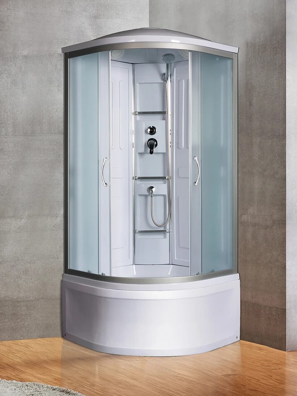 Оснащение Встроенное сиденье / Душевой гарнитур / Передний съемный экран / Переключатель режимов / Полочки / Сифон / Смеситель / Тропический (верхний) душ