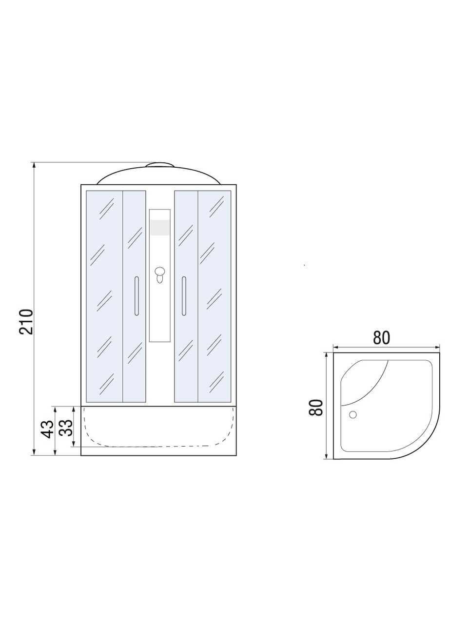 Оснащение Встроенное сиденье / Душевой гарнитур / Передний съемный экран / Переключатель режимов / Полочки / Сифон / Смеситель / Тропический (верхний) душ